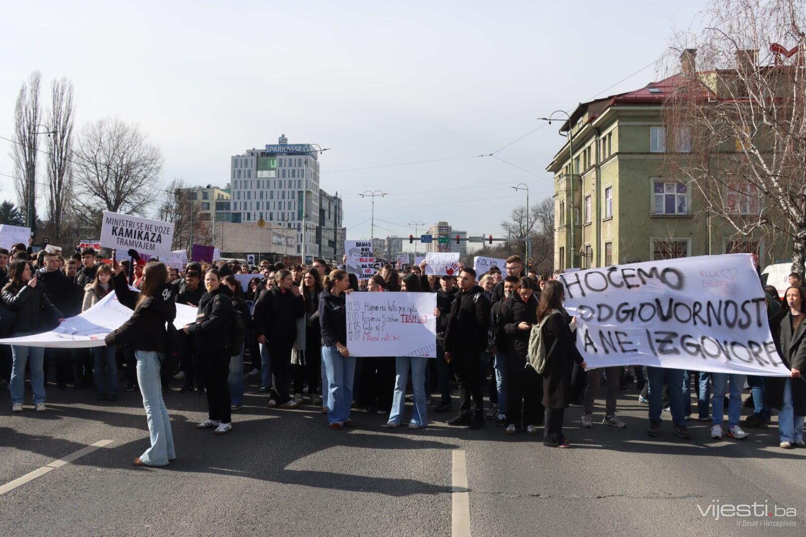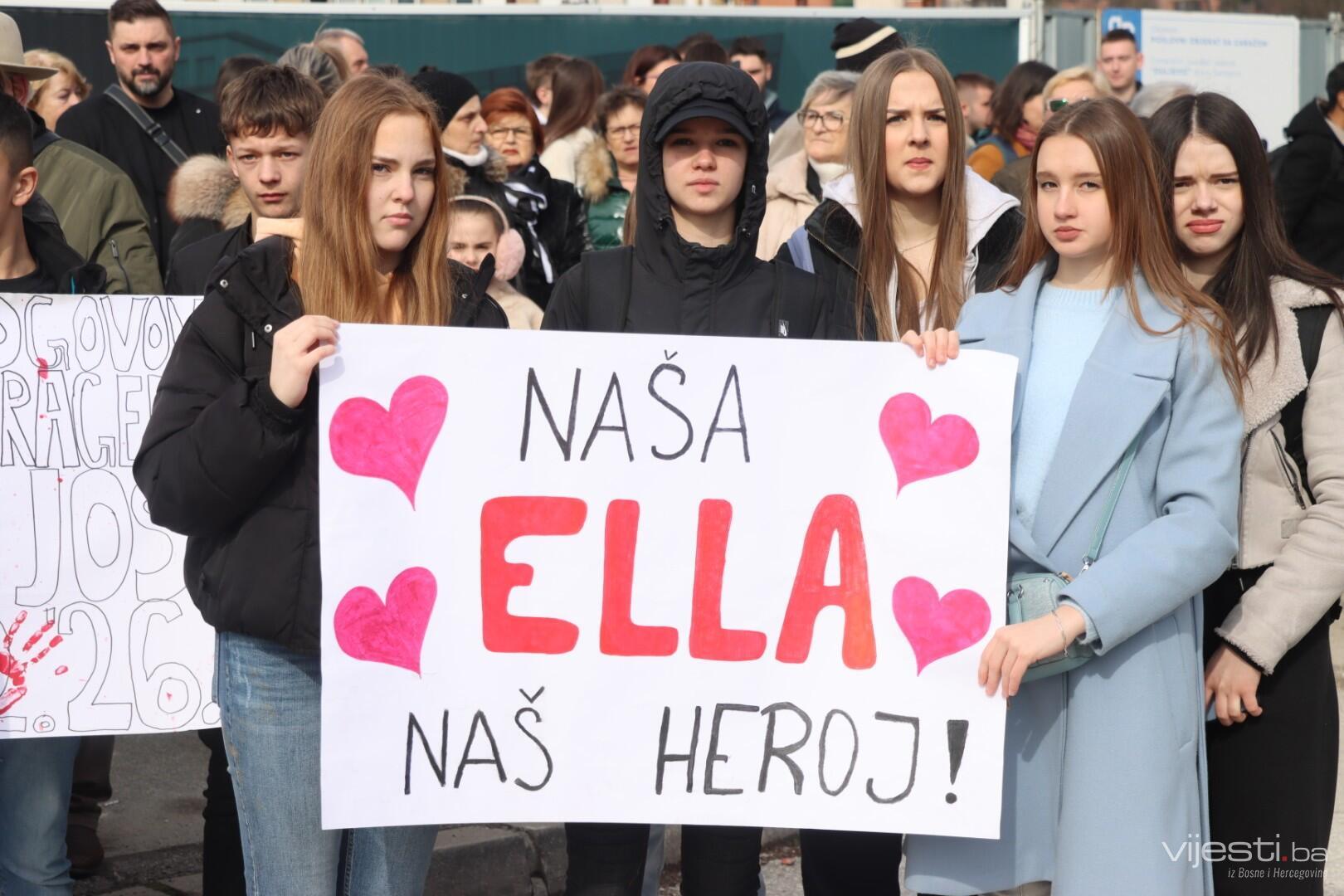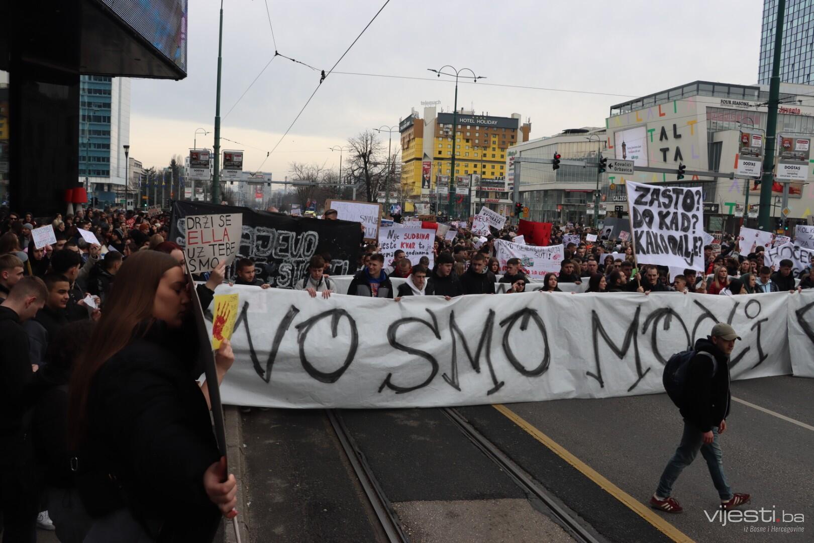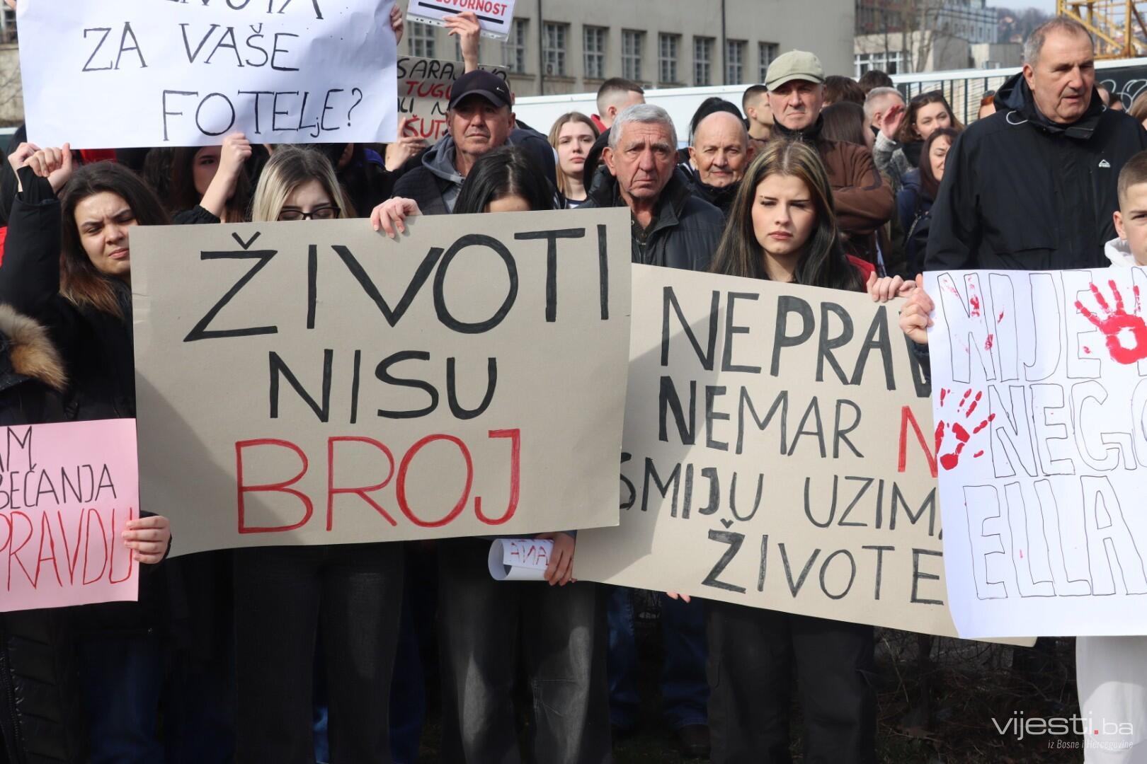 12:20 - "Sarajevo grade, šta ti papci rade". Ovo su poruke sa današnjih transparenata. Održana je minuta šutnje, a uskoro će kolona krenuti prema Općoj bonici gdje se liječi Ella Jovanović.