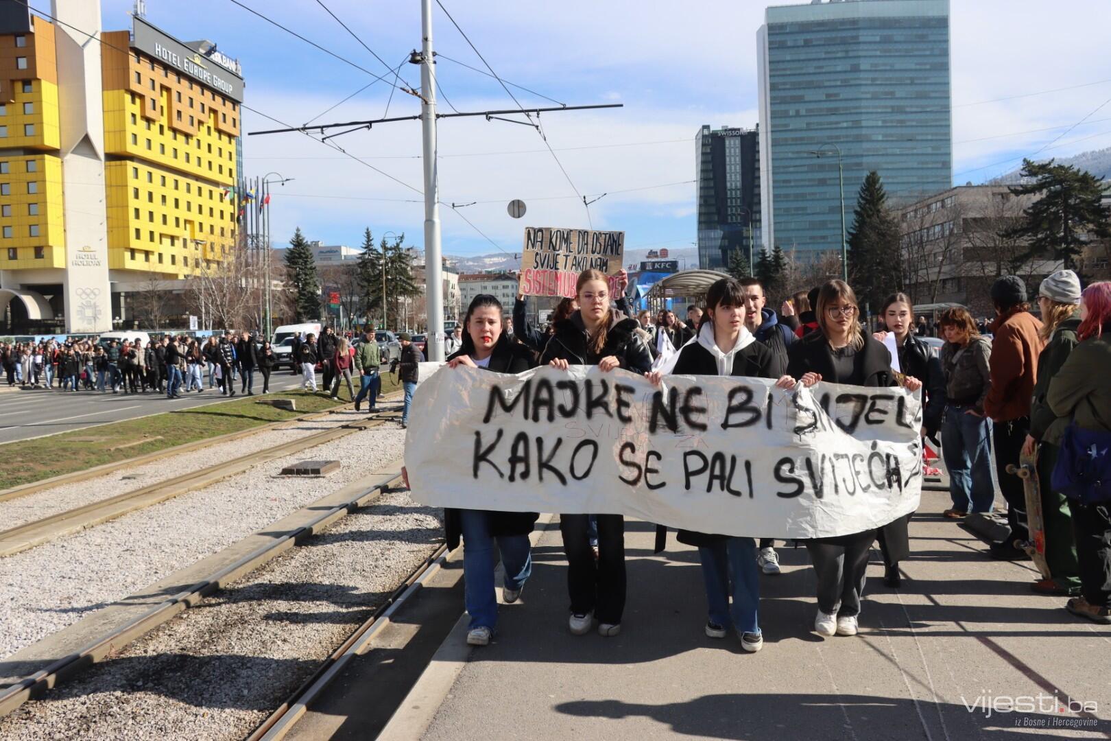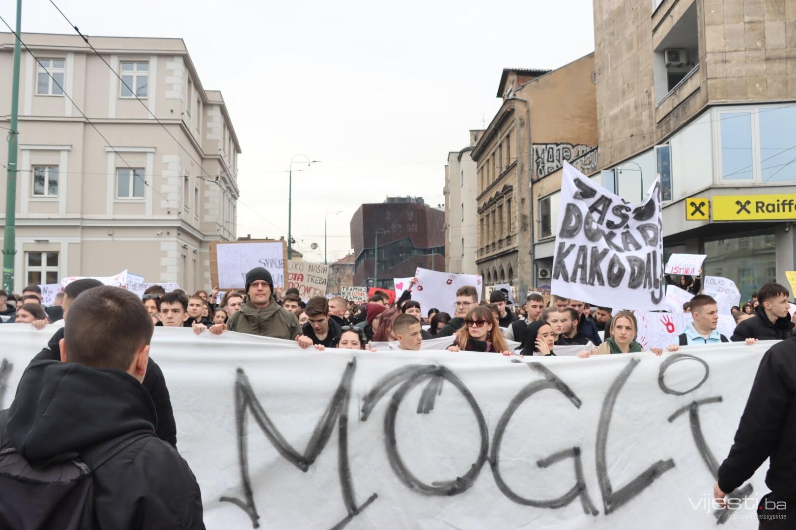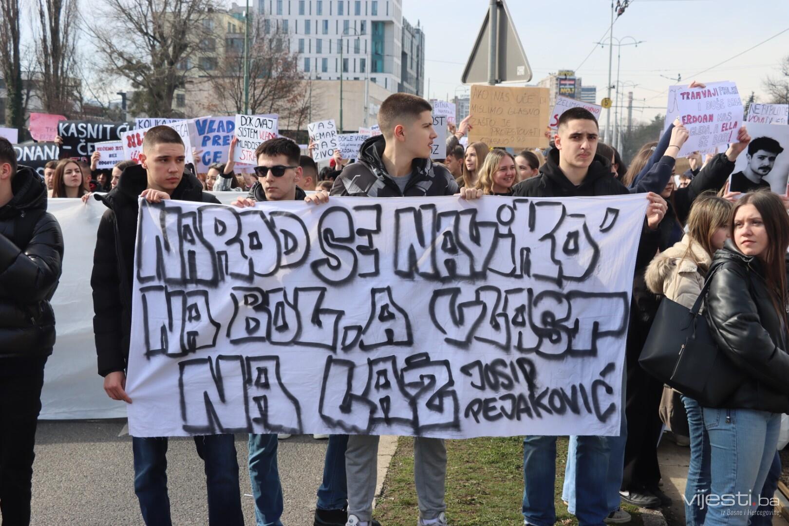 12:11 - Sve je blokirano kod Zemaljskog muzeja. Četvrti skup u Sarajevu, po svemu sudeći, bit će i najmasovniji. Okupljeni nove brojne transparente, a najveći među njima je onaj “Ovo smo mogli biti mi”.