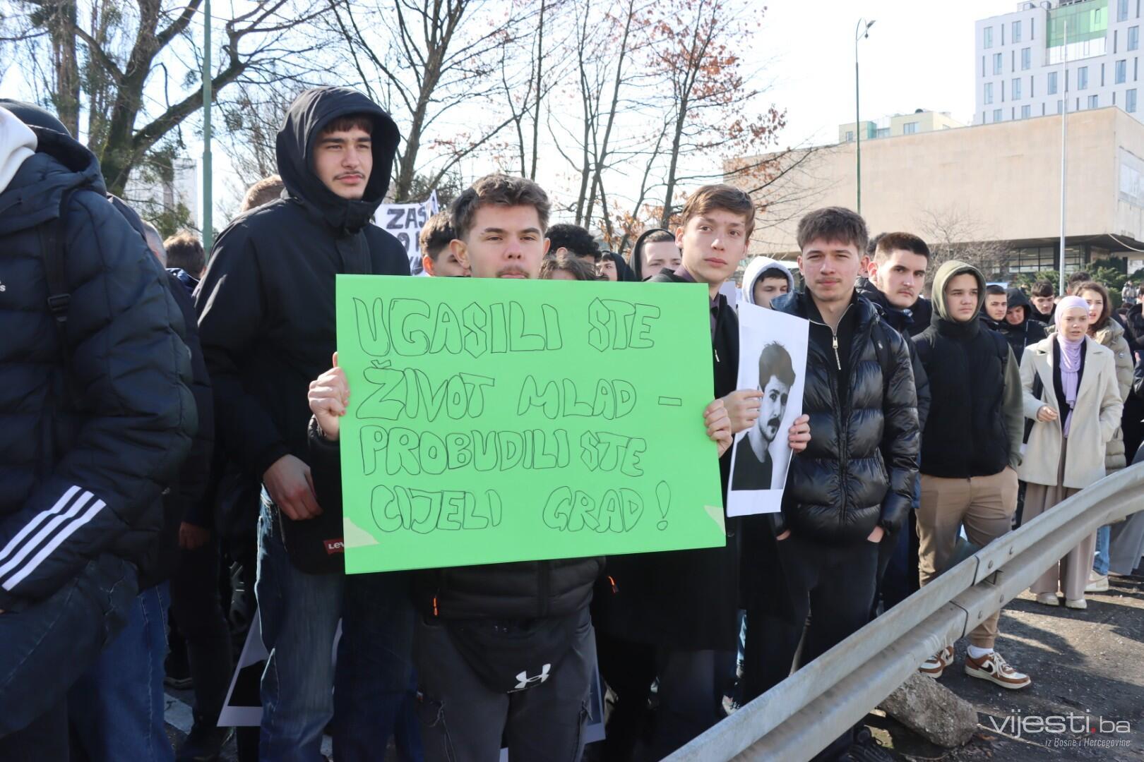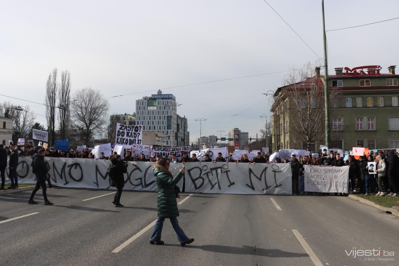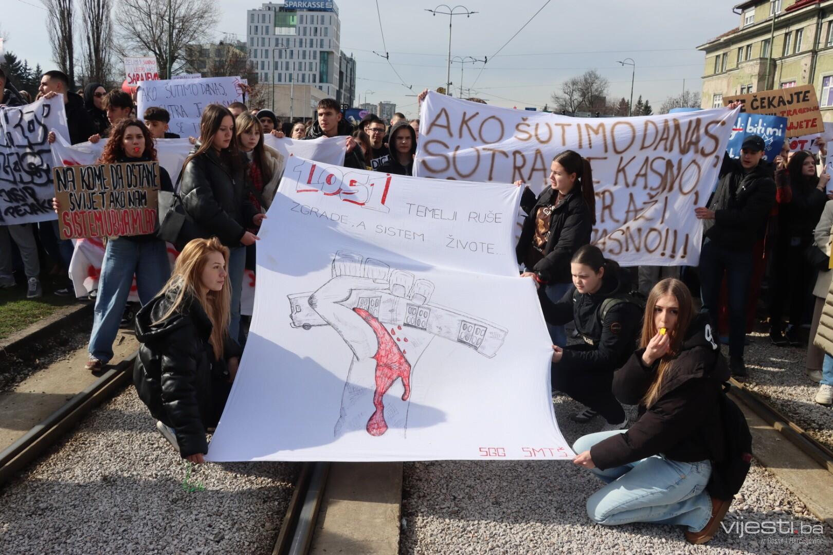 12:11 - Sve je blokirano kod Zemaljskog muzeja. Četvrti skup u Sarajevu, po svemu sudeći, bit će i najmasovniji. Okupljeni nove brojne transparente, a najveći među njima je onaj “Ovo smo mogli biti mi”.