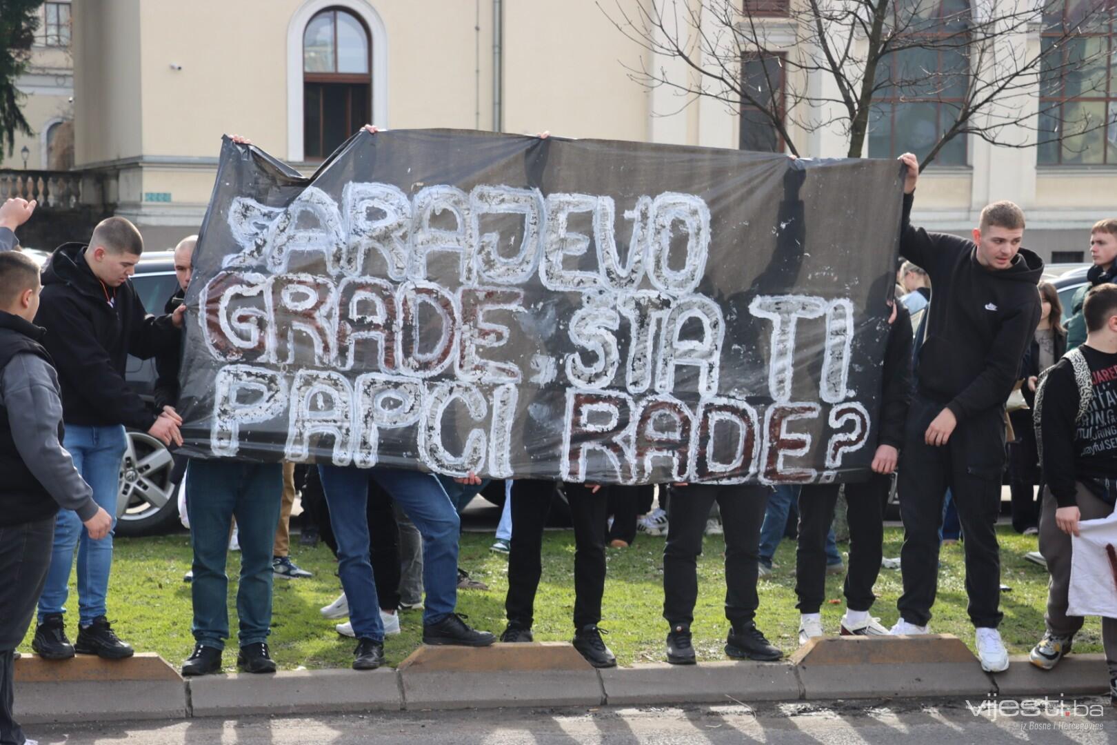 "Sarajevo grade, šta ti papci rade?", piše na jednom od transparenata na današnjim protestima. Vijesti.ba