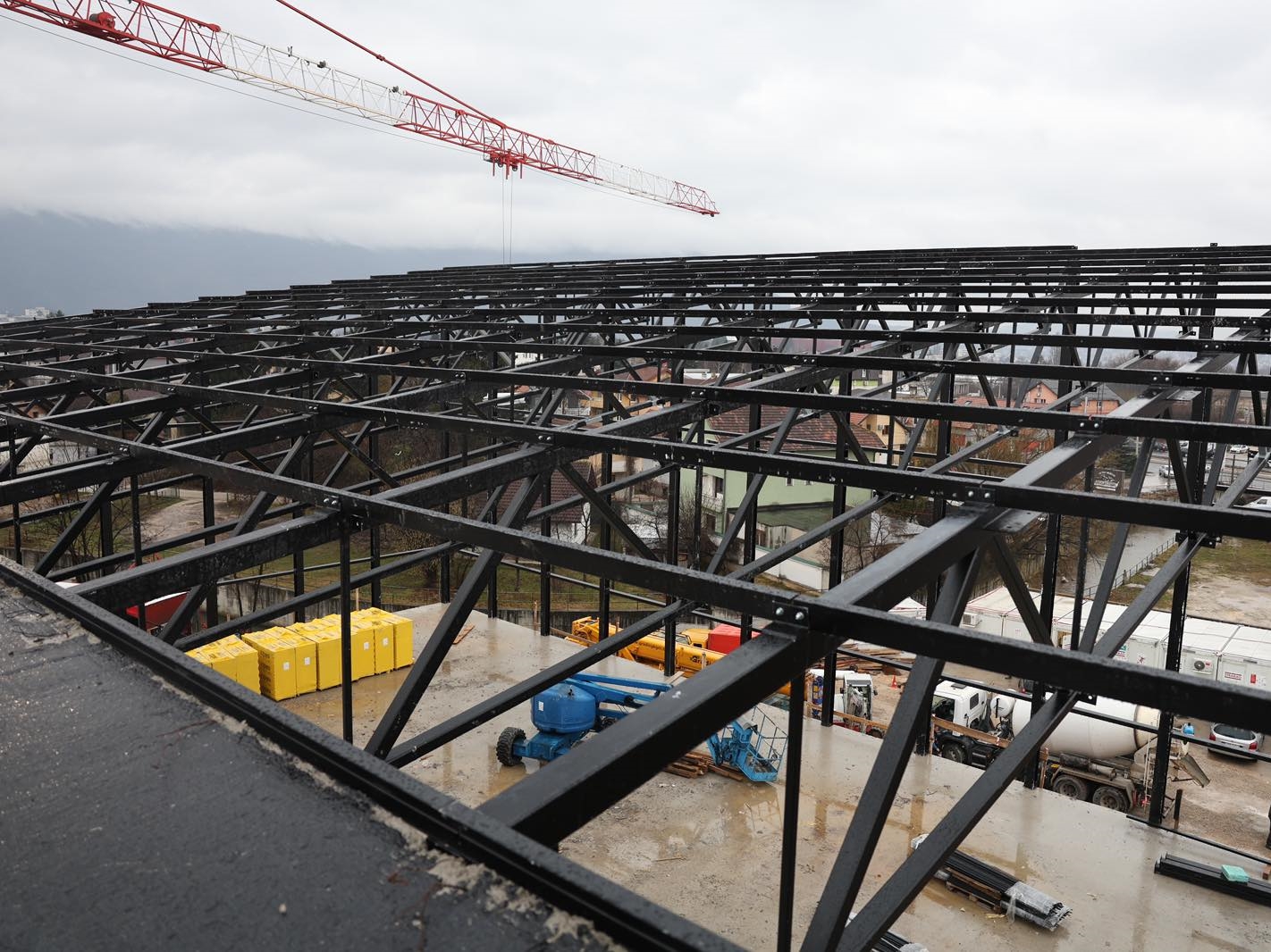 U toku je montaža čelične konstrukcije sportske dvorane, čime objekat dobija svoje jasne arhitektonske obrise. Istovremeno se unutar objekta izvode intenzivni zidarski radovi, kao i postavljanje podova, pregrada i plafona. Ugrađuje se i savremena aluminijska fasada koja će, pored estetske vrijednosti, osigurati visoke standarde energetske efikasnosti i dugotrajnosti objekta.