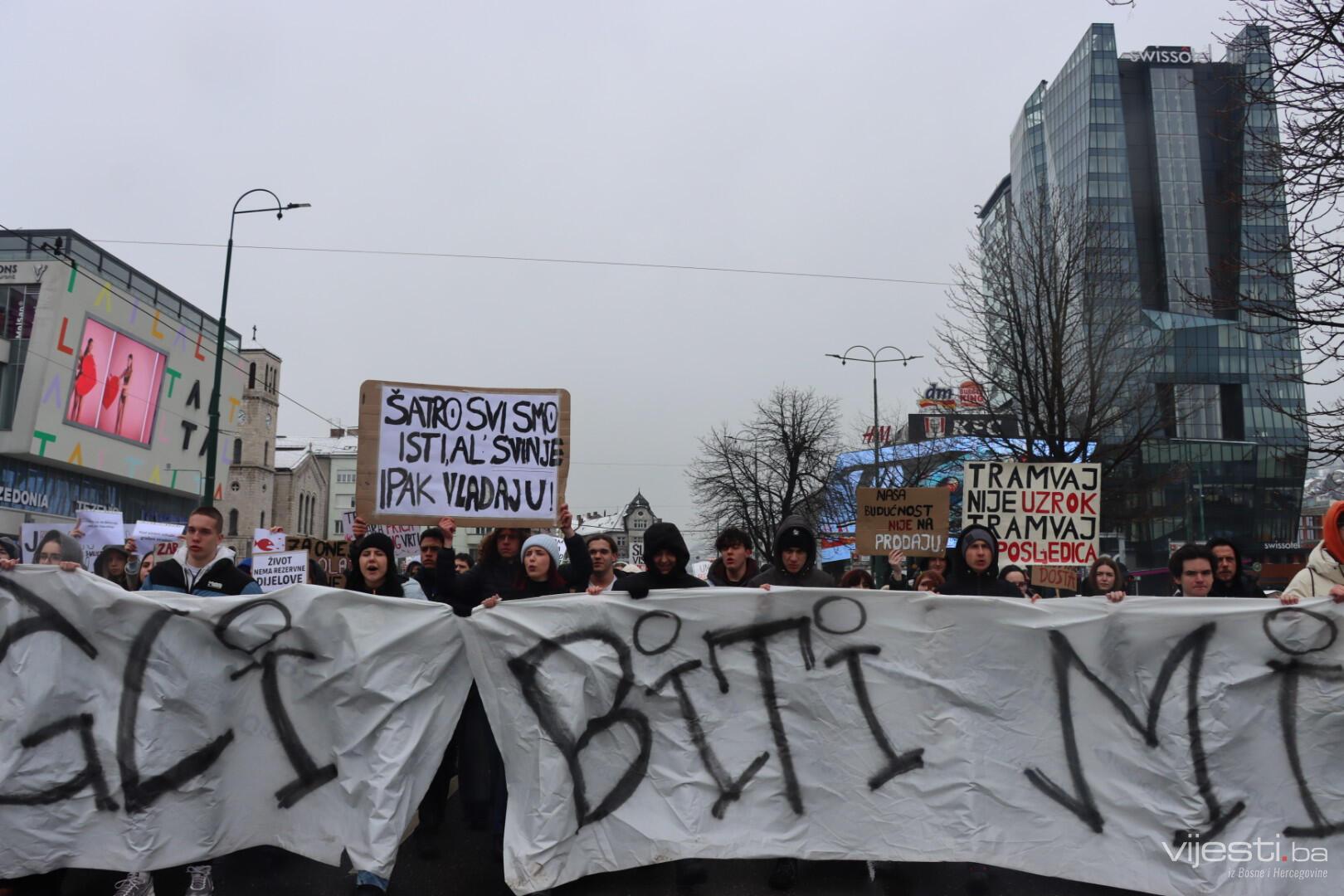 13.25 - Mladi nose transparente sa snažnim porukama upućenim nadležnima. "Koga ćete slati u školu, ako nas pobijete", "Zar je potrebno da nas tramvaji ubiju, da bi Vlada nešto poduzela"...