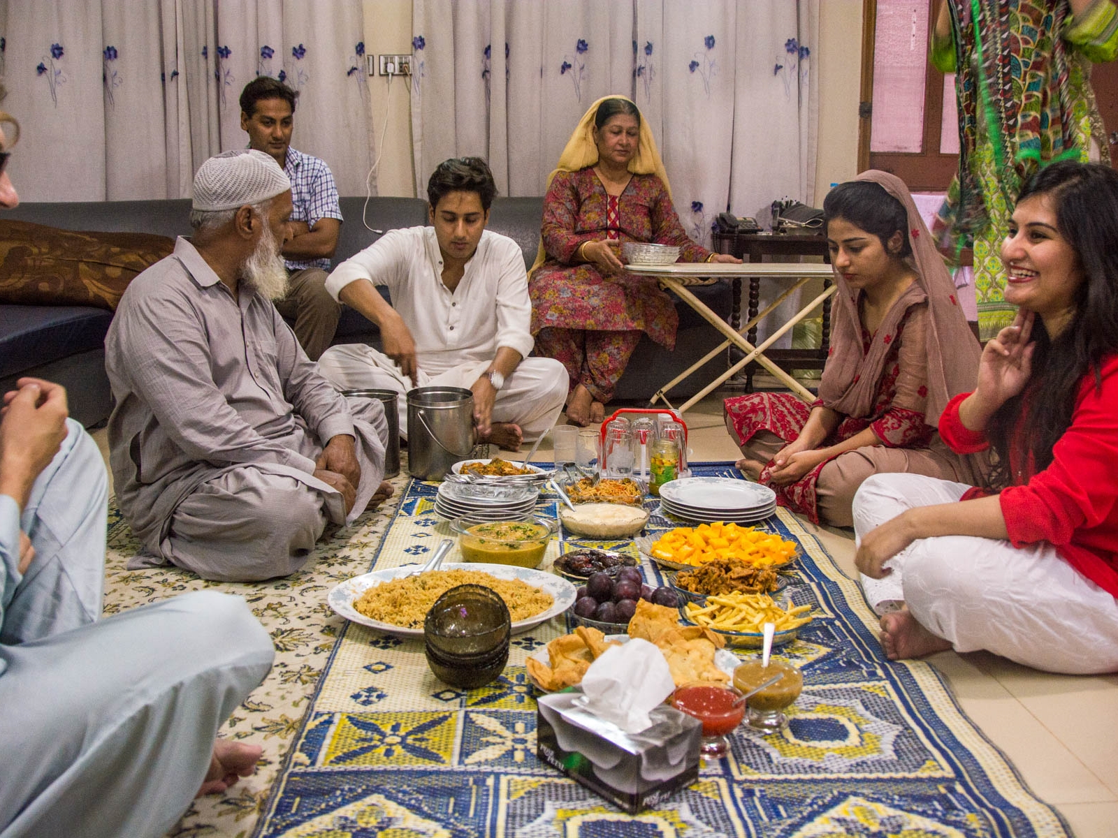 Kada je riječ o iftaru, obroci često uključuju biljni napitak s okusom ruže i pržene poslastice. Za obilježavanje kraja ramazana i početka bajrama, postoji posebna proslava koja se zove "chaand raat". Kao dio ove proslave, žene dobivaju kanu i kupuju šarene dodatke poput narukvica. U iščekivanju, vlasnici trgovina ukrašavaju svoje trgovine posebno za ovu priliku, a postavljaju se i privremeni štandovi s kanom.