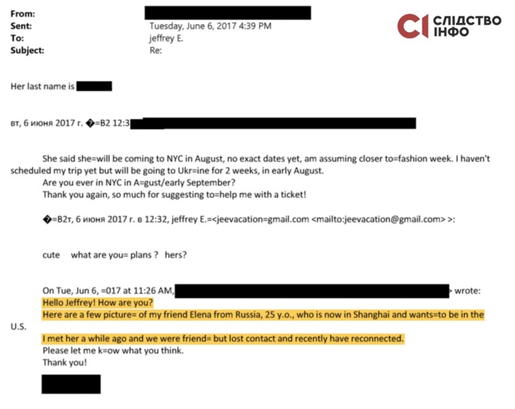 Otprilike u isto vrijeme Nastja piše Epsteinovoj asistentici da joj je obećao pomoći oko puta kući u augustu, kupiti kartu za Kijev te povratnu kartu za New York.