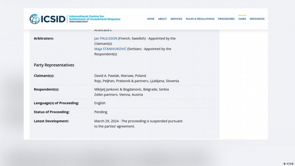 Do aprila 2026. godine odložena je aktivacija tzv. „investicione arbitraže“ pred sudom u Vašingtonu (ICSID). Ovo je „zamrznut“ spor koji Slovenija drži kao rezervnu opciju, neki je tumače kao ucjenu, ukoliko Republika Srpska ne ispuni obaveze iz već presuđenog spora u Beogradu.