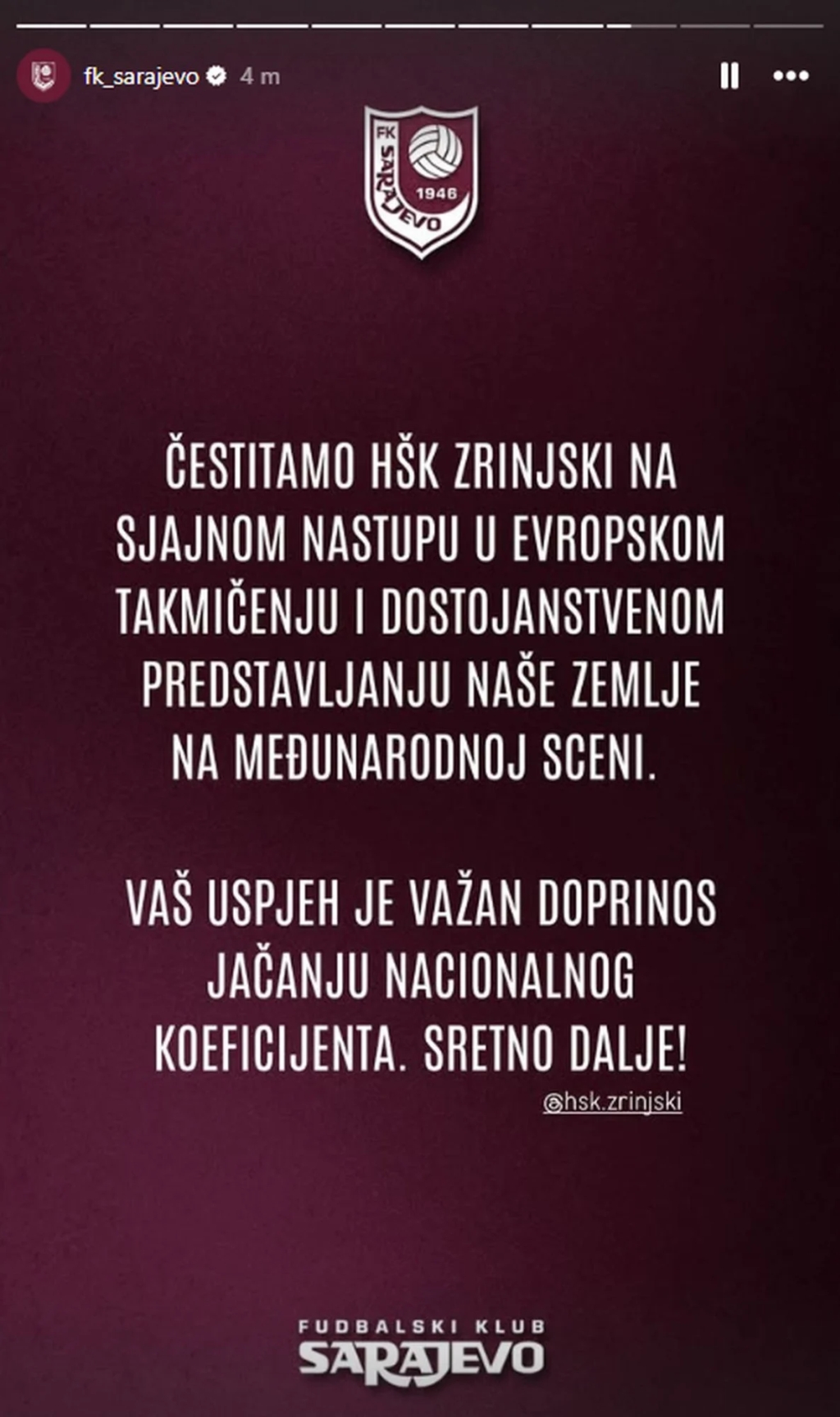 "Čestitamo HŠK Zrinjski na sjajnom nastupu u evropskom takmičenju i dostojanstvenom predstavljanju naše zemlje na međunarodnoj sceni", navodi se u poruci Sarajeva i dodaje: