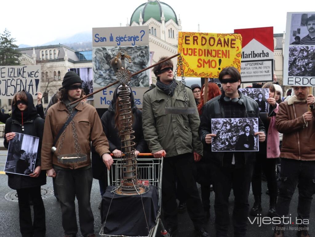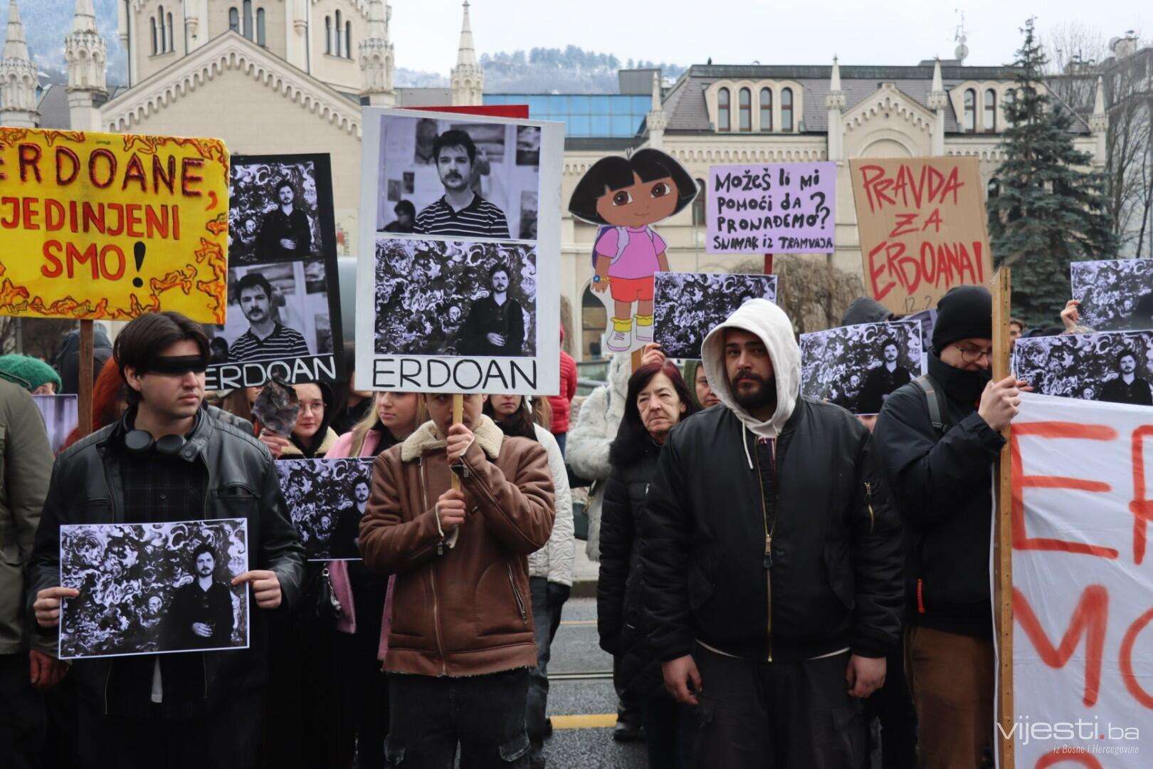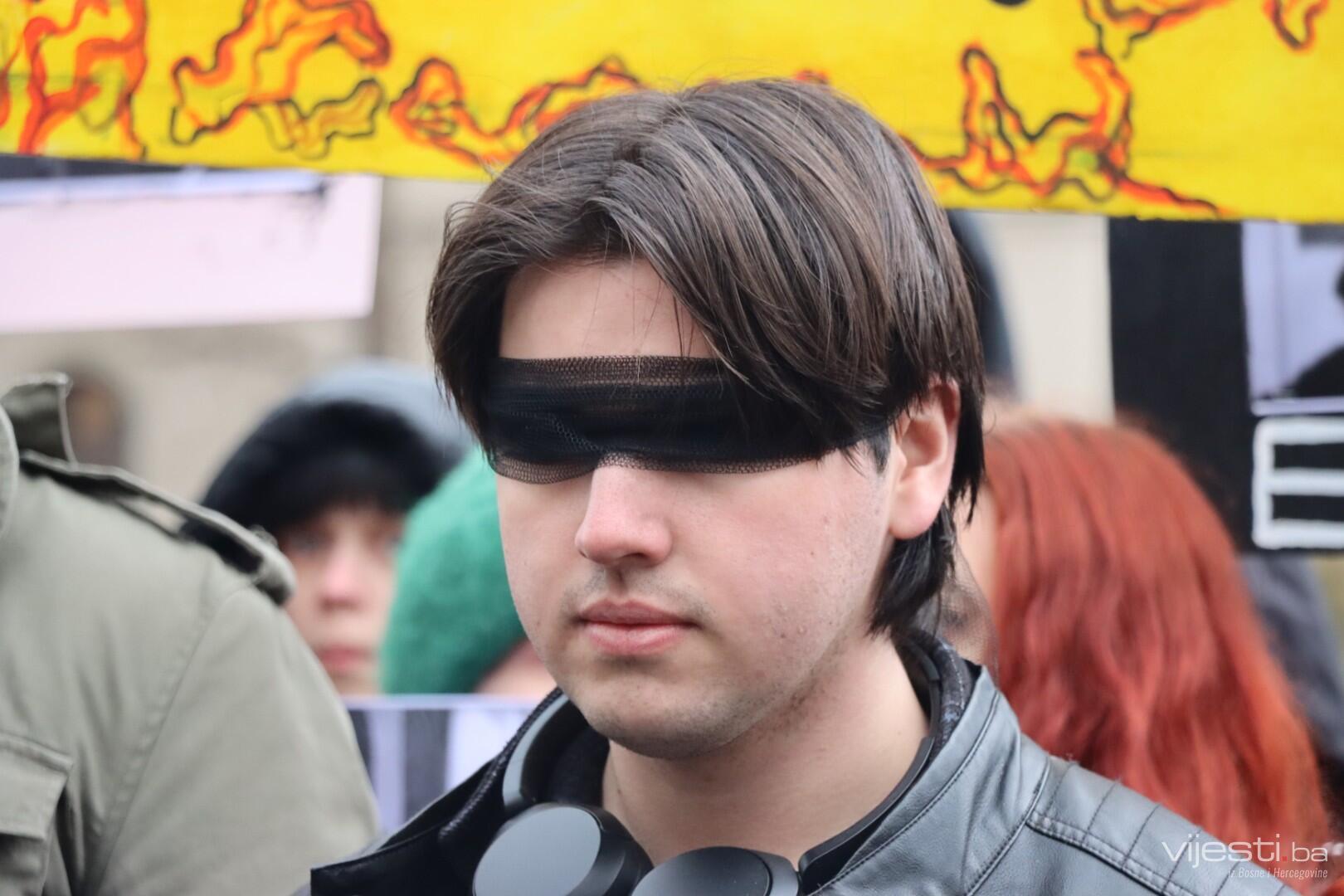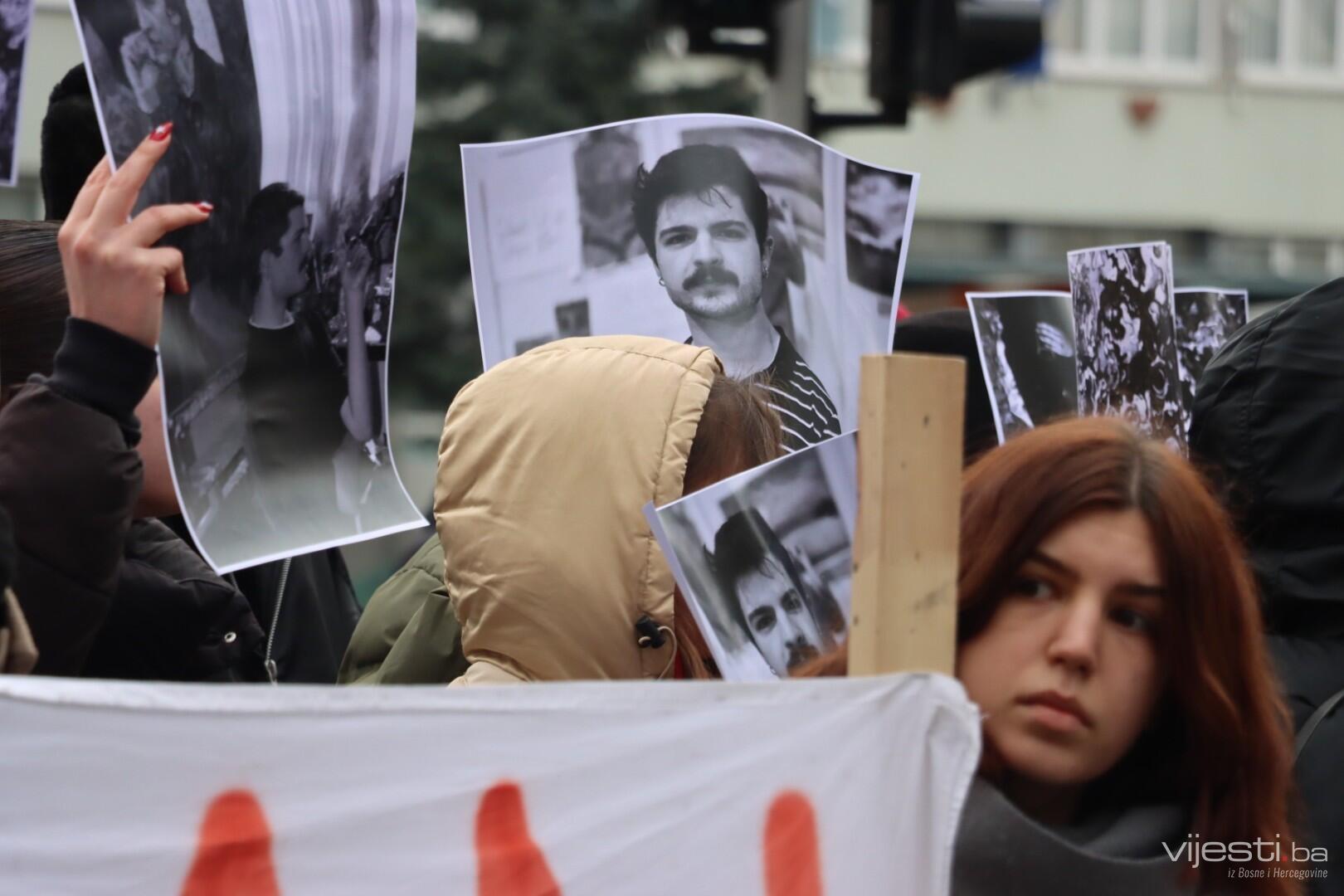 Kolege tragično stradalog Erdoana (23) pojavili su se pred Akademijom sa crnim povezima oko očiju i mnogim porukama na kojima, između ostaloga, piše: