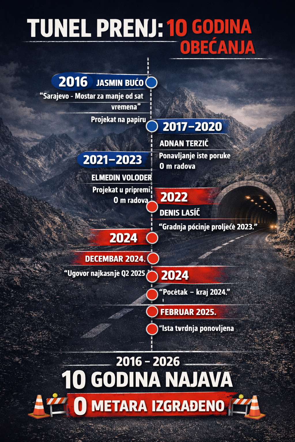 Naime, deset godina od prvih najava, projekt izgradnje tunela Prenj nalazi se na istom mjestu gdje je bio i početkom 2016. godine, samo na papiru.