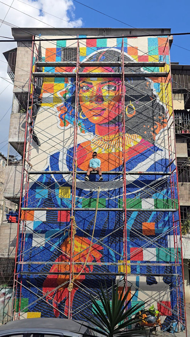 Masivni mural napravljen od plastičnih čepova za flaše prikazuje latinoameričku verziju čuvene Mona Lise, kraseći skromnu stambenu zgradu u radničkom naselju izvan glavnog grada Salvadora.