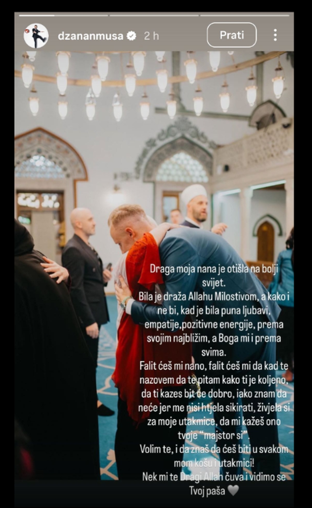 "Draga moja nana je otišla na bolji svijet. Bila je draža Allahu Milostivom, a kako i ne bi, kad je bila puna ljubavi, empatije, pozitivne energije prema svojim najbližim, a Boga mi i prema svima", napisao je Musa, pa nastavio: