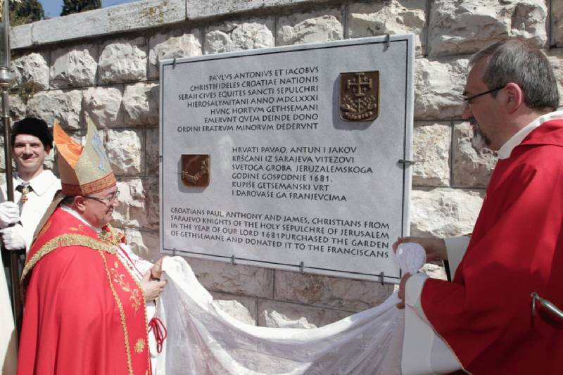 "Hrvati Pavao Antun i Jakov, kršćani iz Sarajeva vitezovi Svetoga groba jeruzalemskog godine gospodnje 1681. kupiše Getsemanski vrt i darovaše ga franjevcima", ispisano je na spomen-ploči.