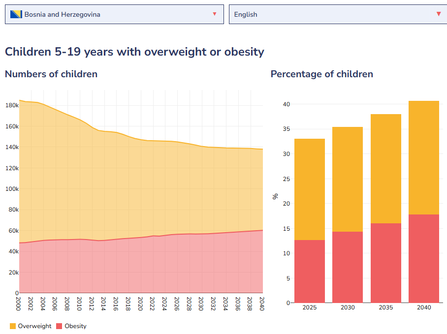 Prema izvještaju, u Bosni i Hercegovini je u 2025. godini bilo 55.000 djece od 5 do 9 godina s pretilošću ili gojaznošću, a 90.000 djece i tinejdžera od 10 do 19 godina s pretilošću ili gojaznošću.