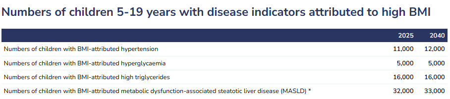 Izvještaj procjenjuje da će do 2040. godine 370.000 djece u dobi od pet do 19 godina u Velikoj Britaniji pokazivati znakove kardiovaskularnih bolesti, a 271.000 se procjenjuje da će pokazivati znakove hipertenzije.