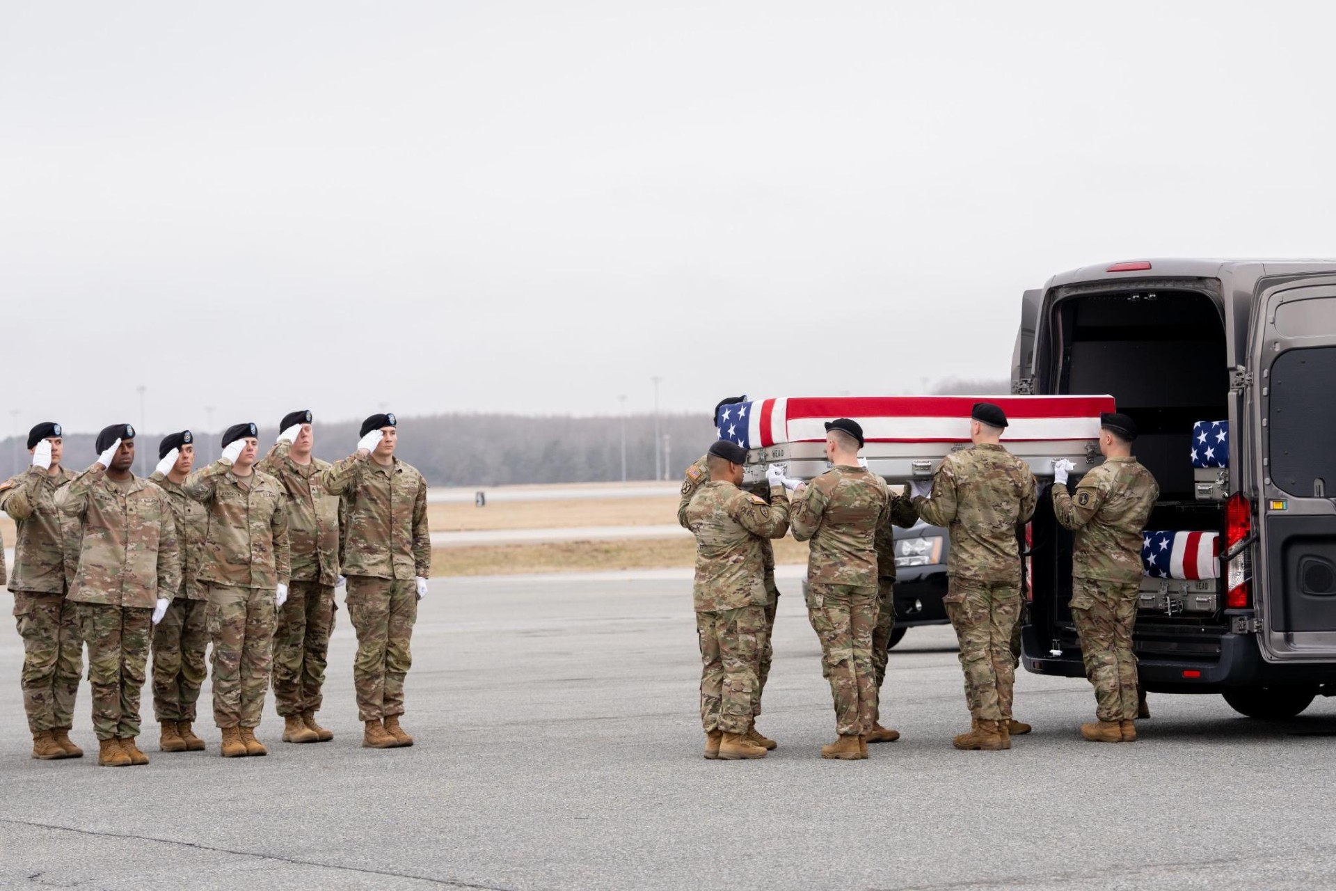 Ovo je dostojanstven obred tokom kojeg se posmrtni ostaci jedan po jedan istovaruju iz vojnog transportnog aviona i utovaruju u pogrebno vozilo pod budnim okom prisutnih zvaničnika, koji ostaju nepomični i tihi.