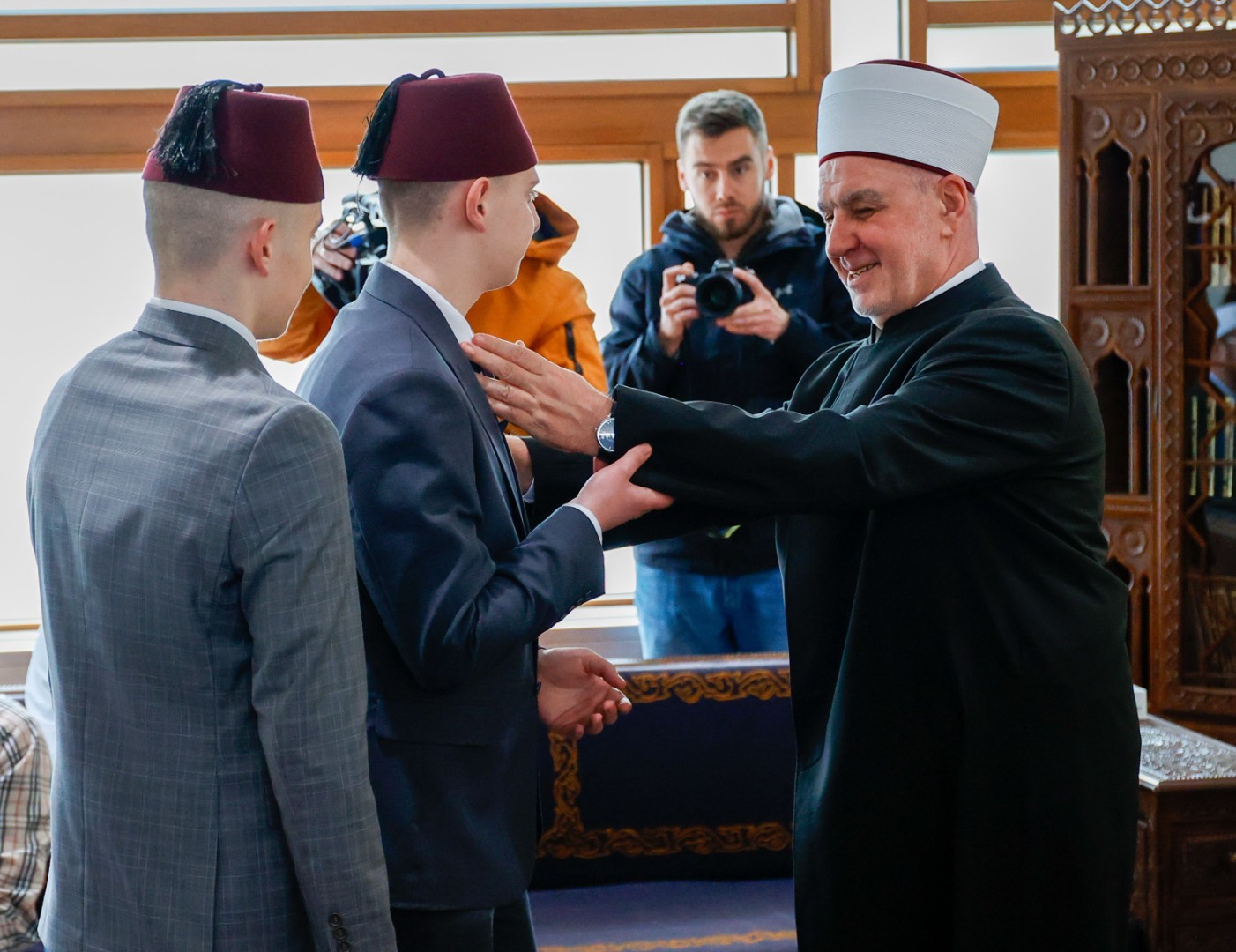 Čestitanje je upriličeno nakon centralne bajramske svečanost Rijaseta Islamske zajednice u Gazi Husrev-begovoj džamiji u Sarajevu, gdje je reisu-l-ulema Kavazović u bajramskoj hutbi pozvao vjernike da u vremenu smutnje, epskog nasilja i stradanja, u vremenu podjela i malodušnosti, ostanu prisebni i ne dozvole da ih drugi uvuku u svoje vrtloge zla.