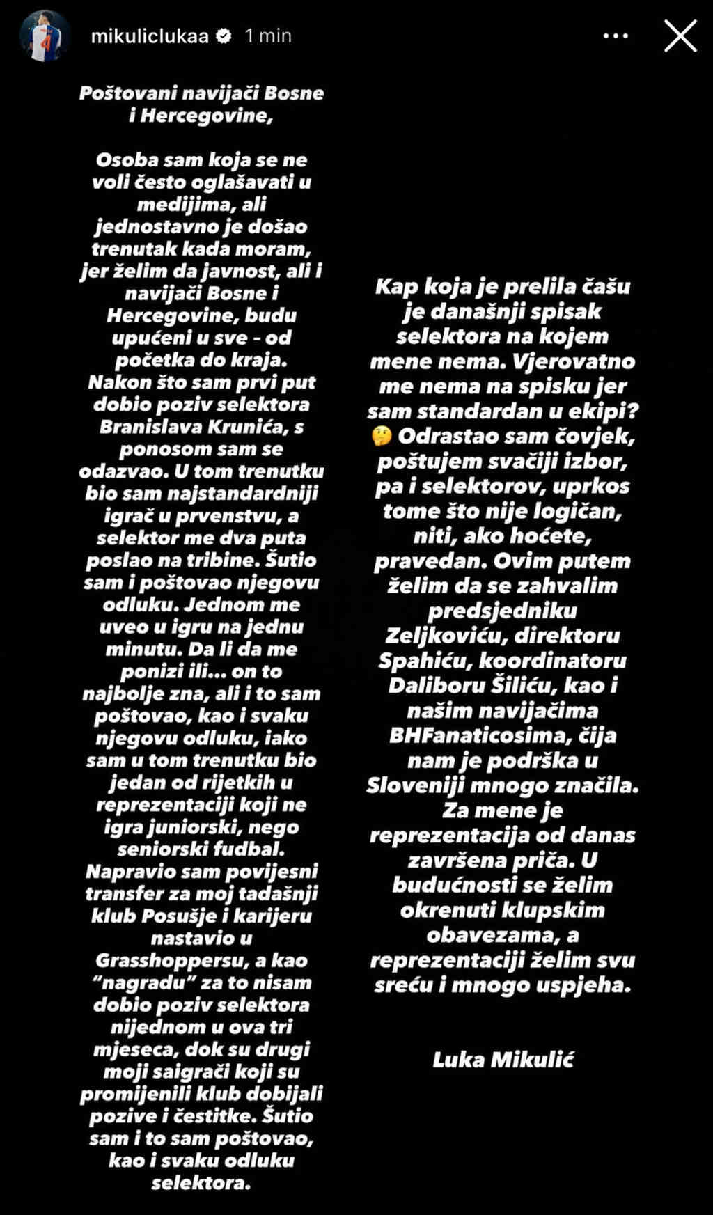 Na kraju poruke, Mikulić se zahvalio ljudima iz Saveza i navijačima, posebno BHFanaticosima, te potvrdio da se okreće klupskim obavezama.