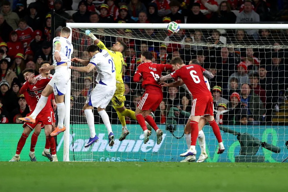 KAKVA ODBRANA DARLOWA! Džeko je lijepo spustio za Demirovića, on šutirao glavom, ali sjajno reaguje golman Velsa! Nevjerovatno šta je izvadio!