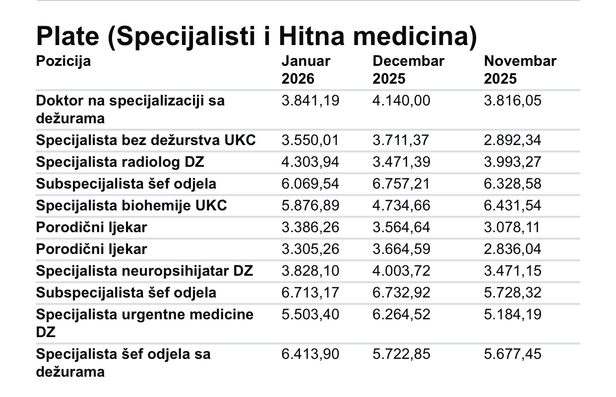 Podaci pokazuju da su osnovne plate ljekara značajno rasle u proteklih pet godina. Osnovna plata specijaliste u 2021. godini iznosila je 2.209 KM, dok je u 2026. godini ona narasla na 3.210 KM. Uz redovne dodatke, ovaj iznos prosječno doseže 3.968 KM.