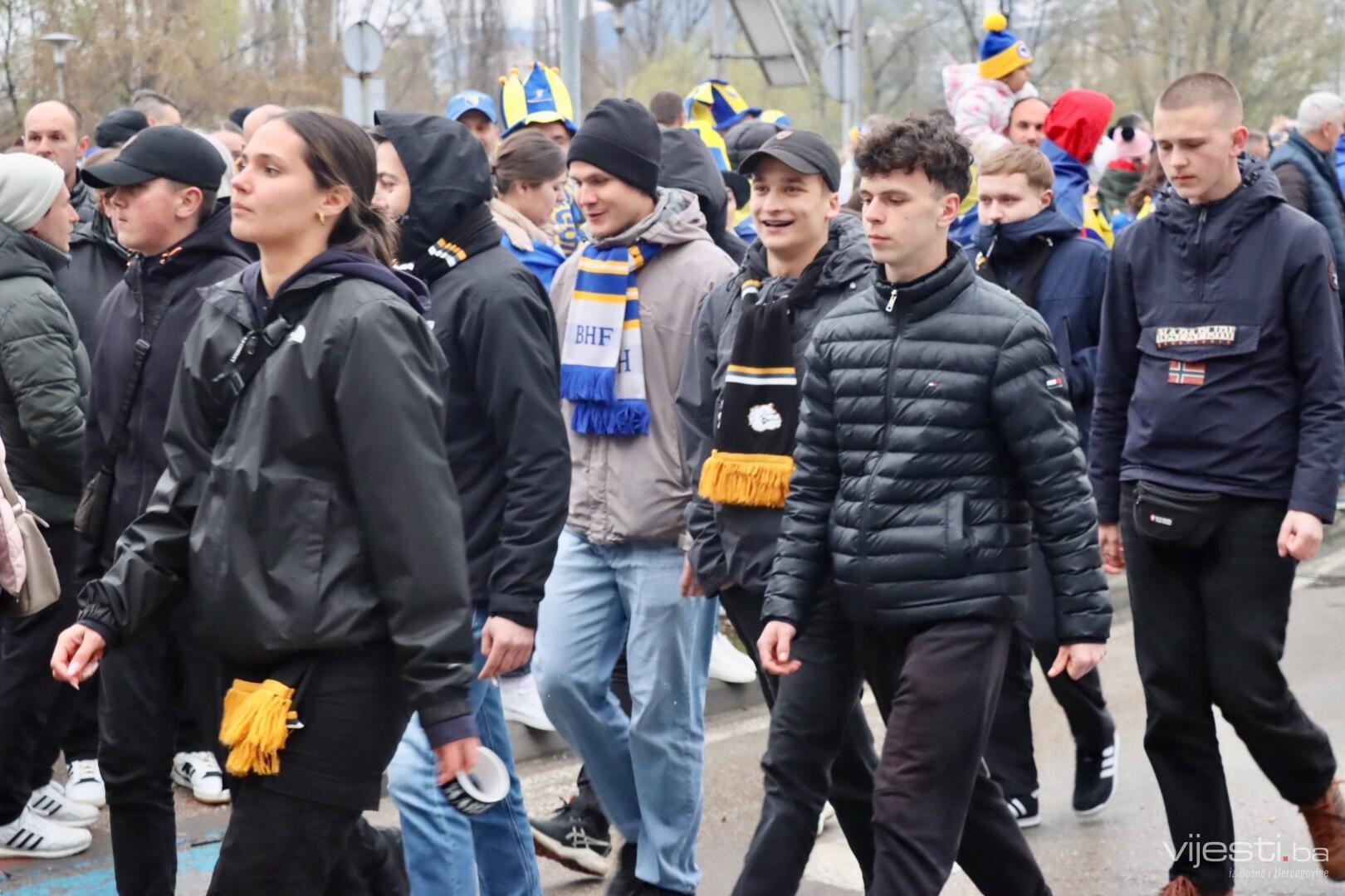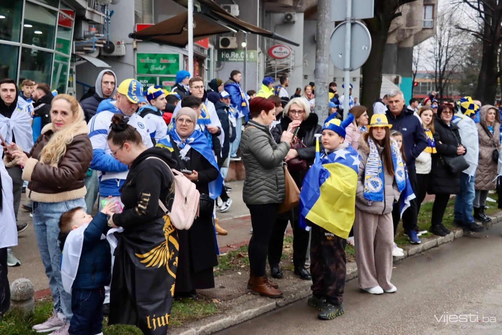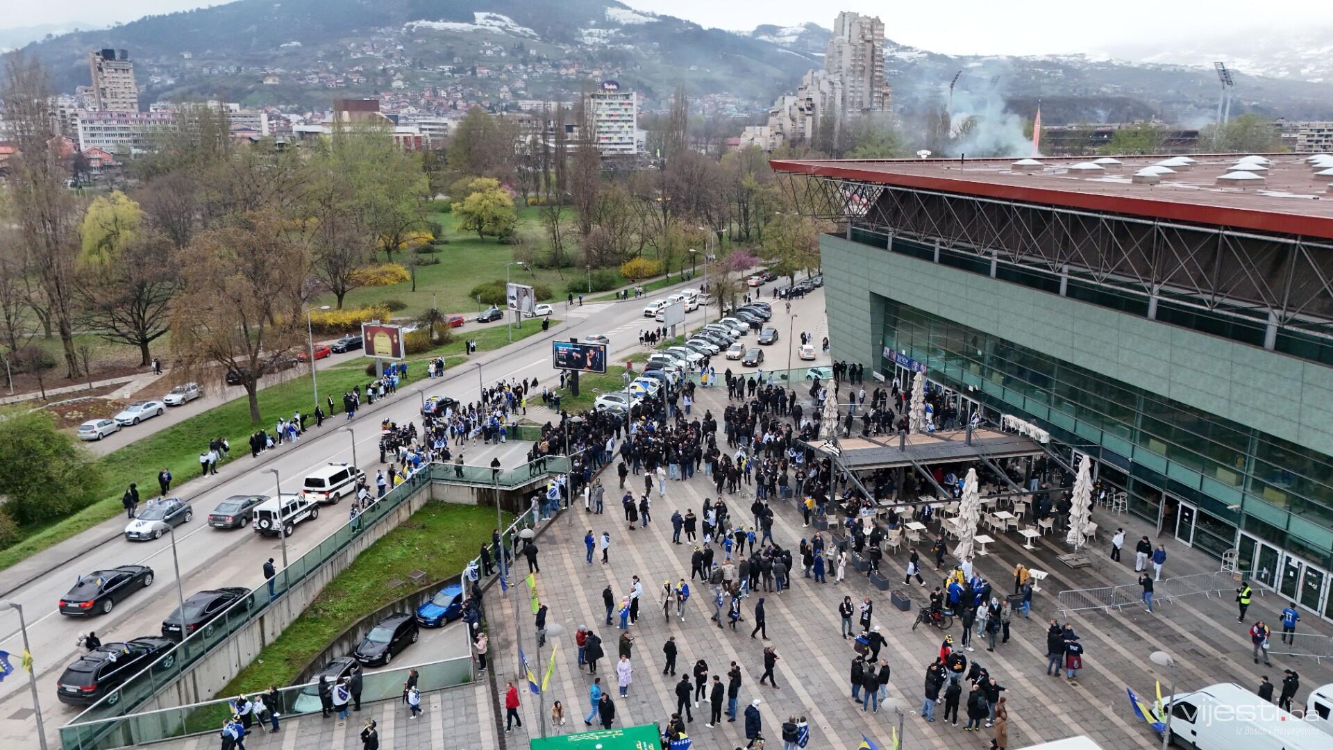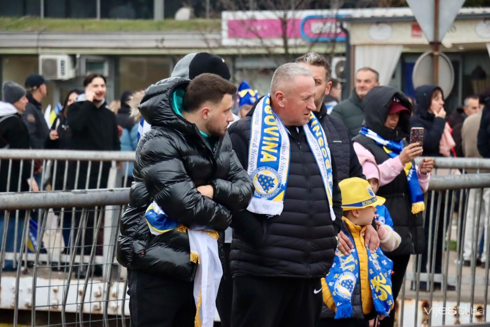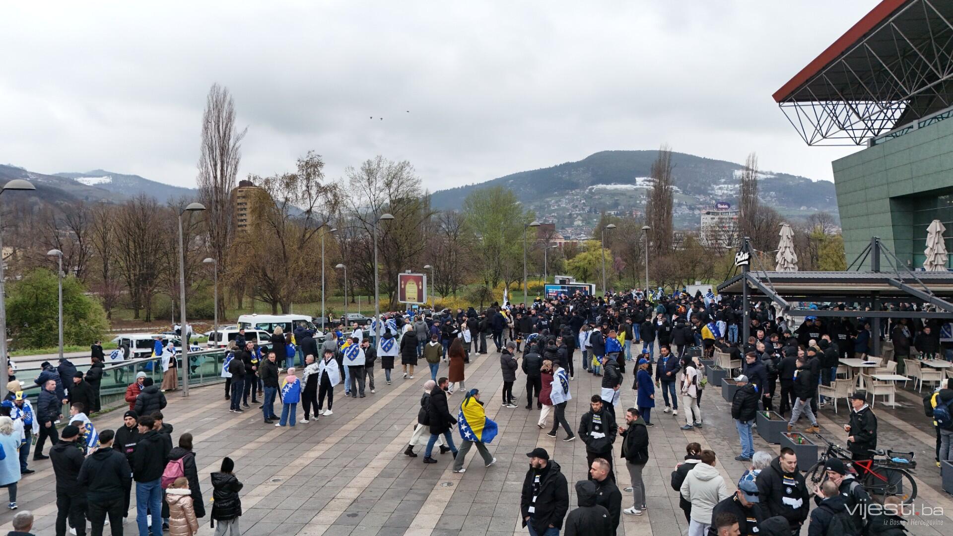Grad je već satima u znaku reprezentacije, a centralno okupljanje navijača organizovano je ispred Arene Zenica. Odatle su se u velikom korteu uputili prema stadionu Bilino polje, uz pjesmu, baklje i prepoznatljivu navijačku energiju.