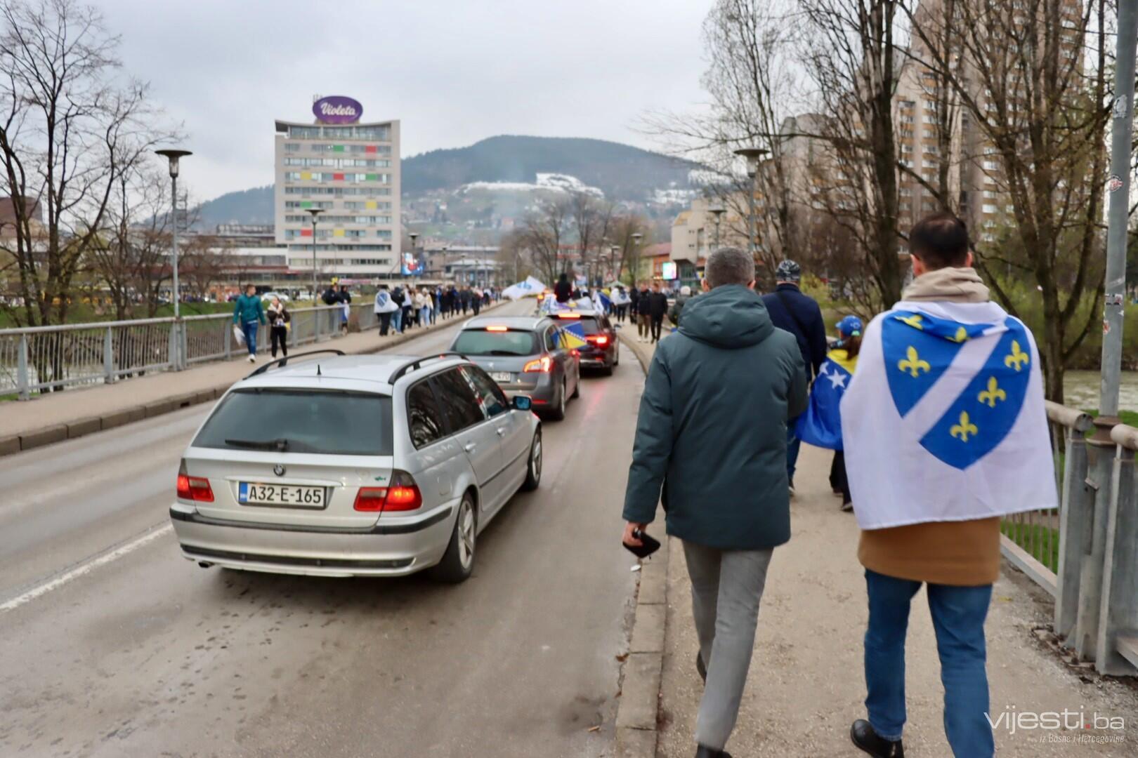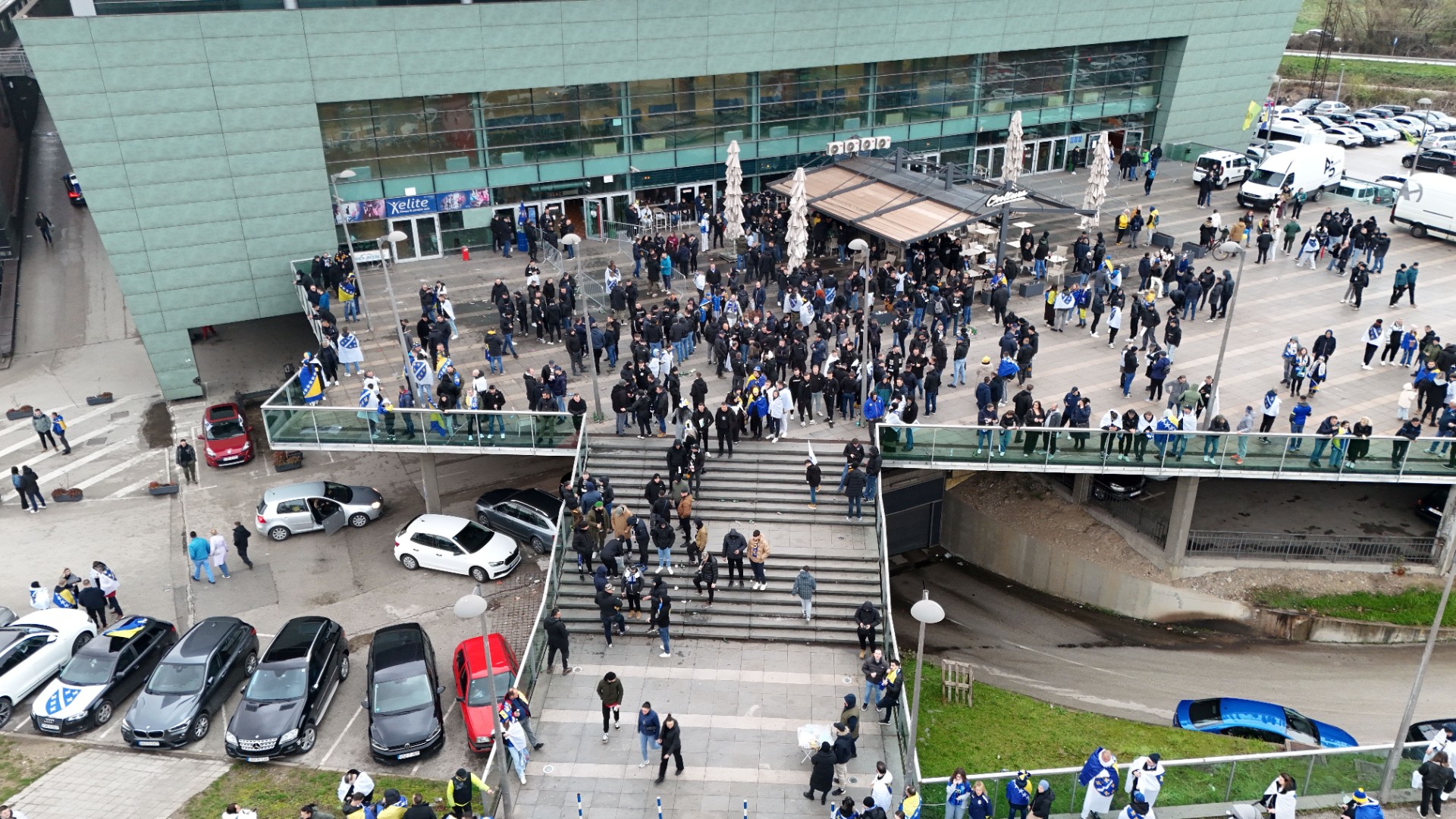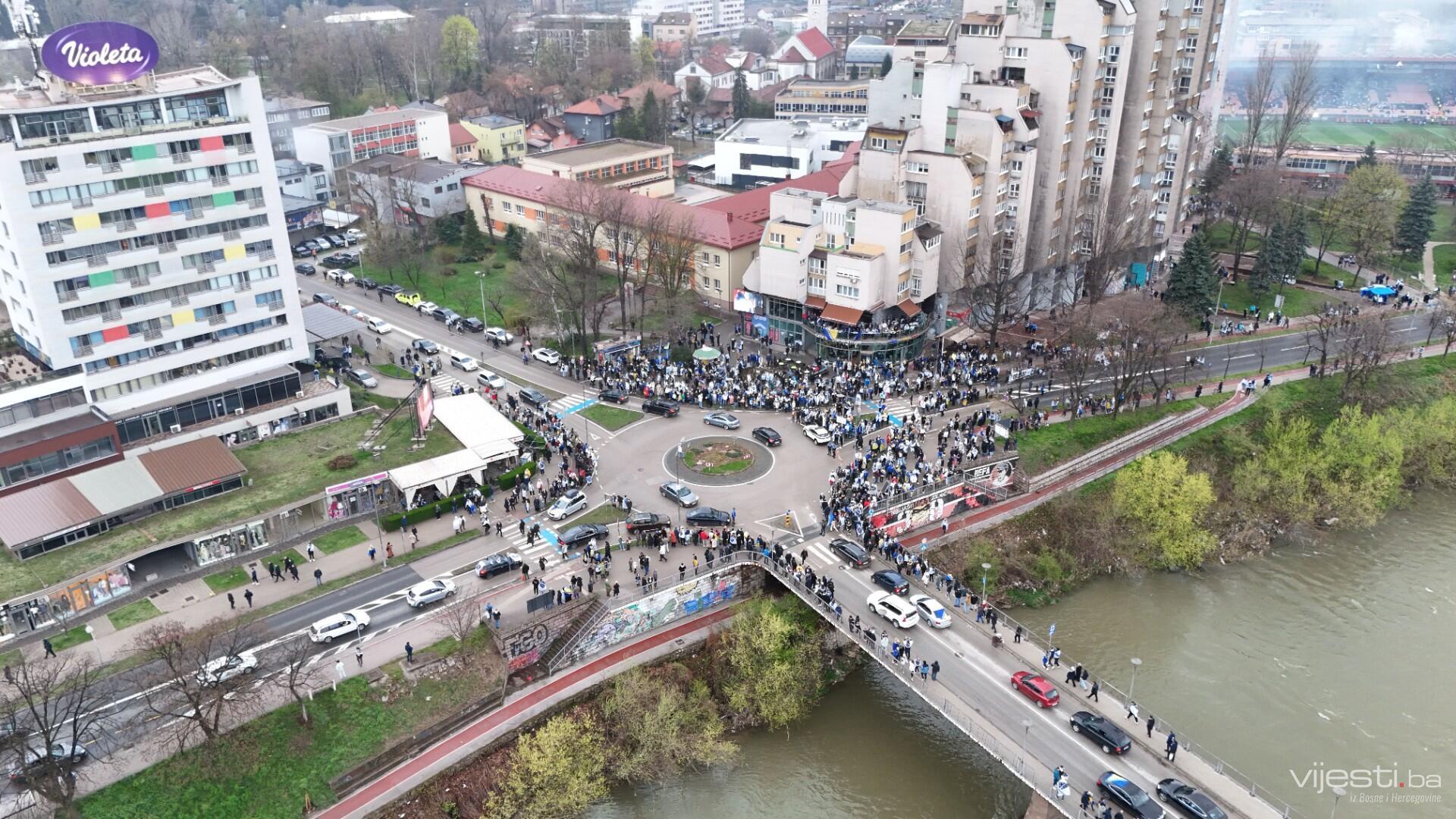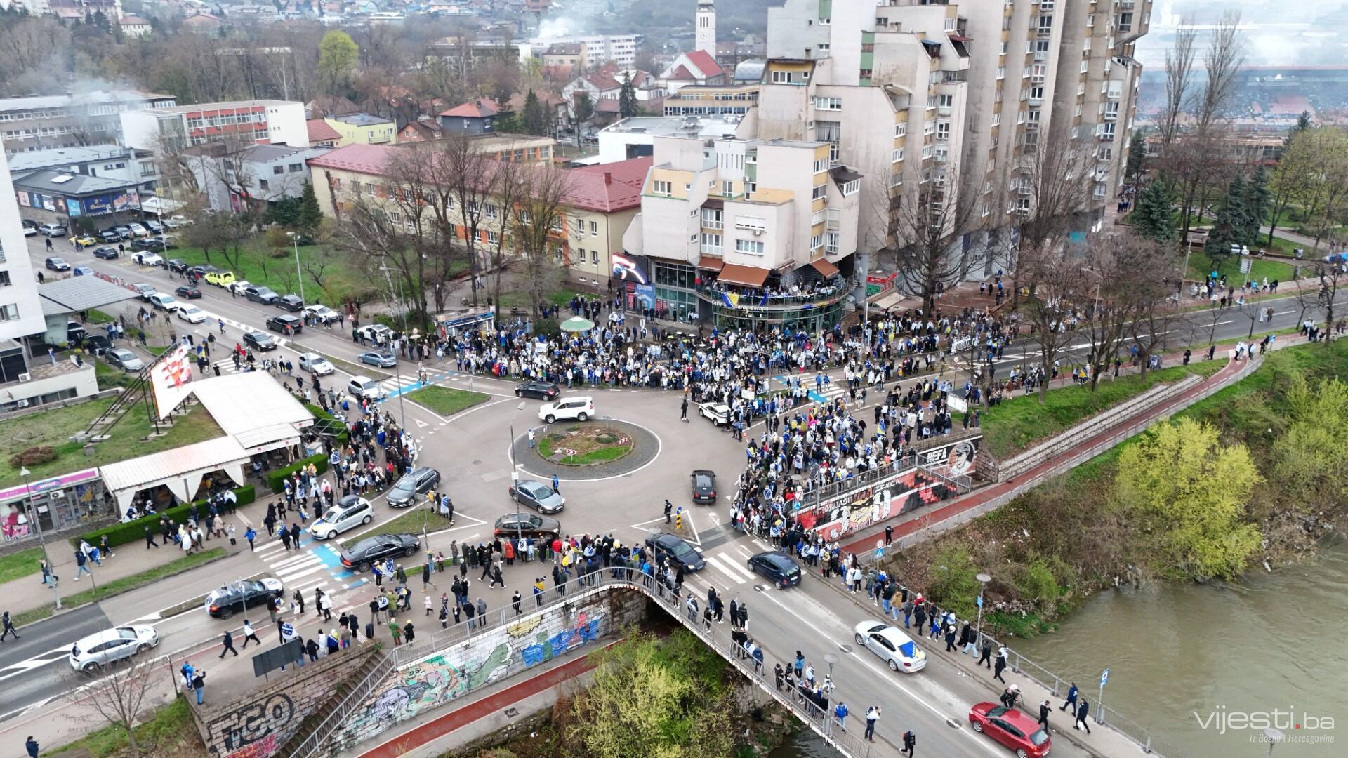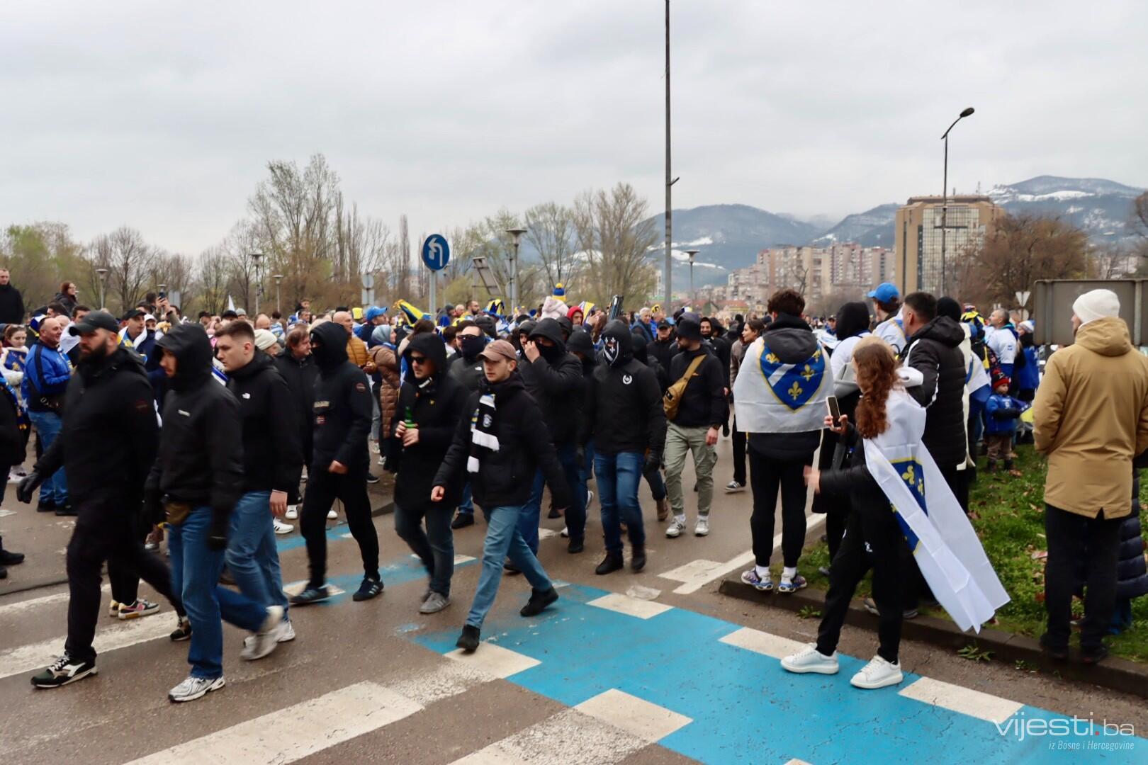 Grad je već satima u znaku reprezentacije, a centralno okupljanje navijača organizovano je ispred Arene Zenica. Odatle su se u velikom korteu uputili prema stadionu Bilino polje, uz pjesmu, baklje i prepoznatljivu navijačku energiju.