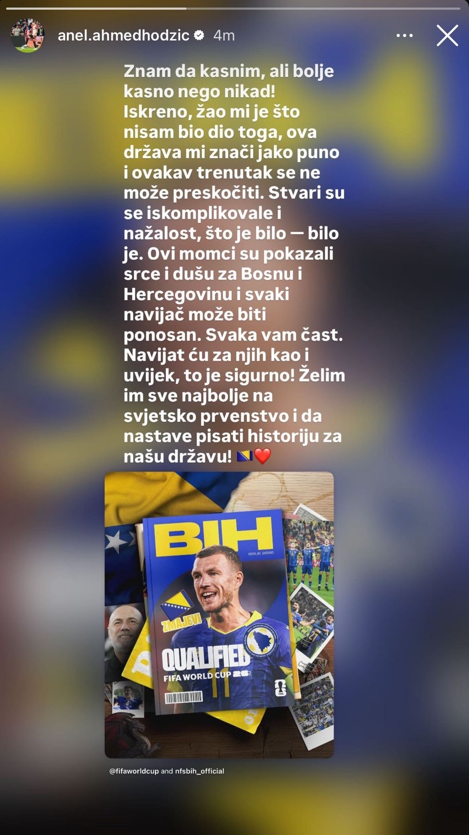 Bivši reprezentativac Bosne i Hercegovine Anel Ahmedhodžić oglasio se na društvenim mrežama povodom historijskog plasmana Bosne i Hercegovine na Svjetsko prvenstvo.