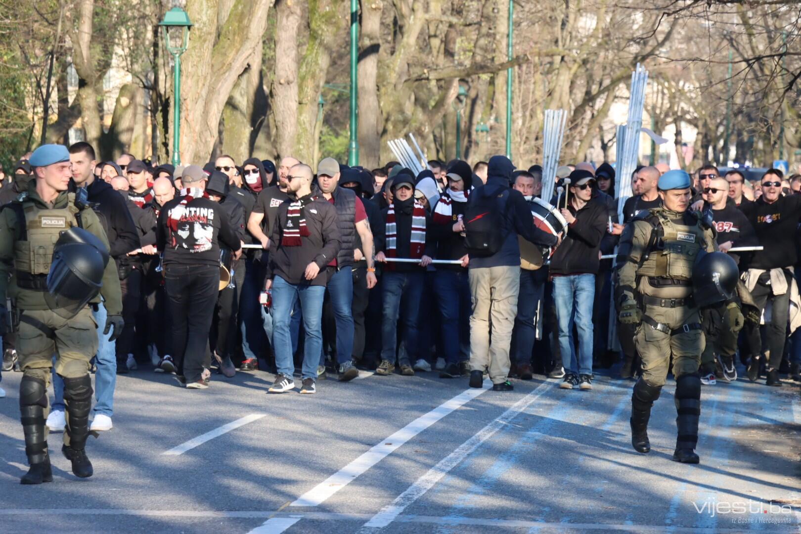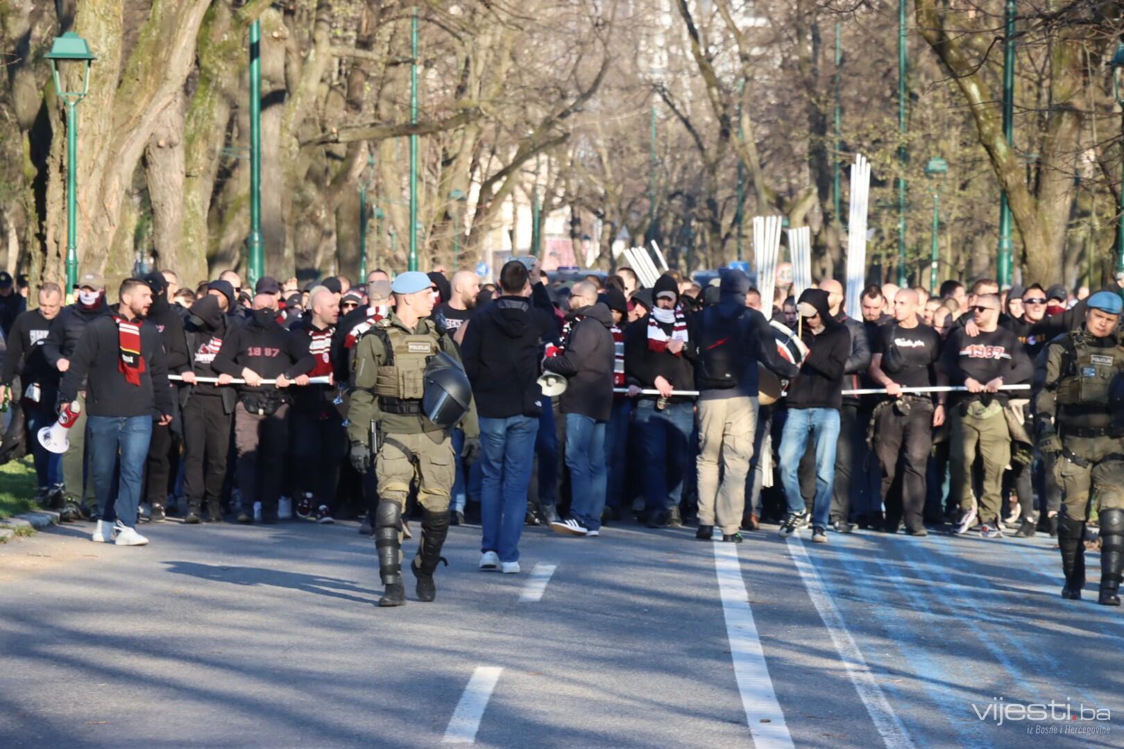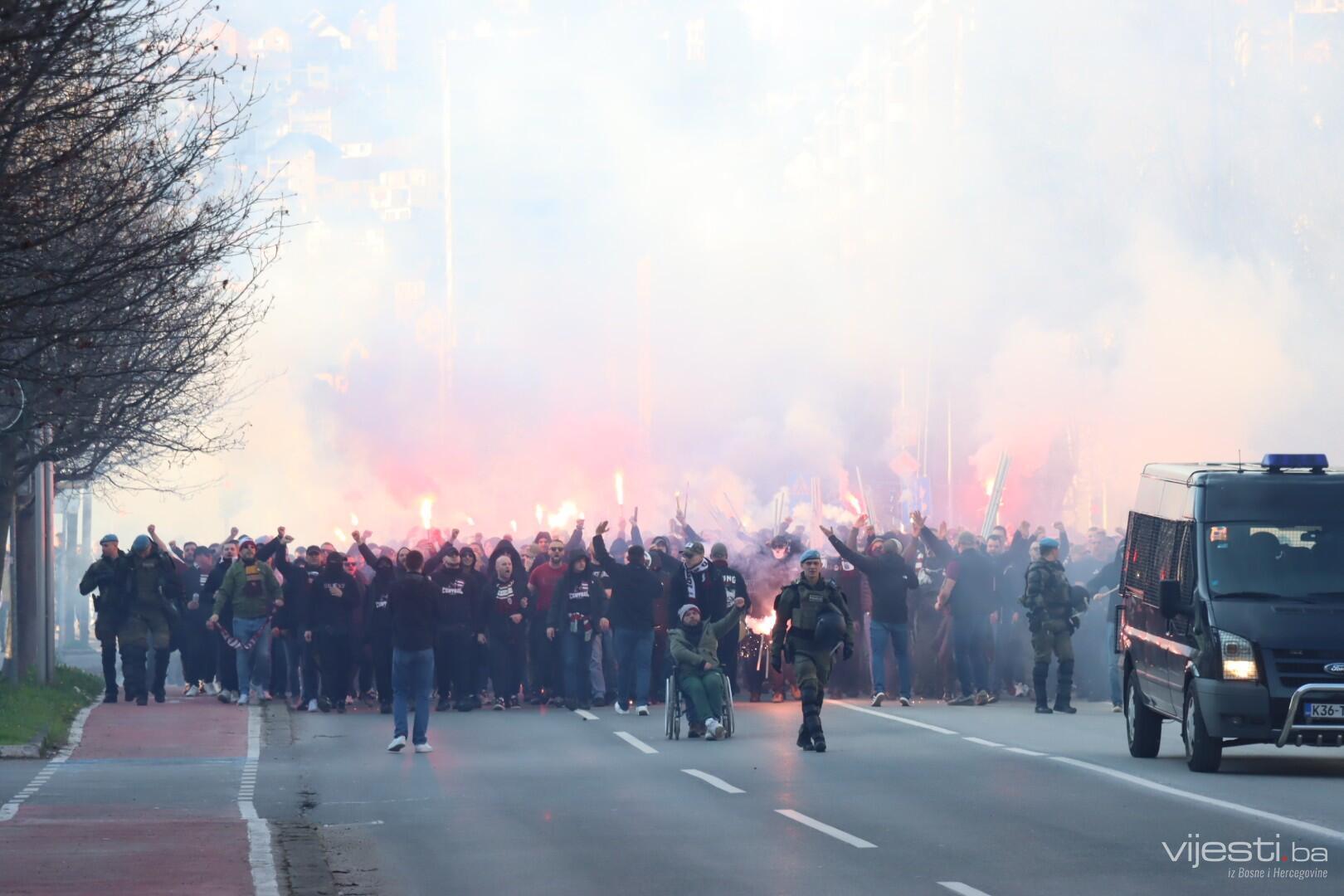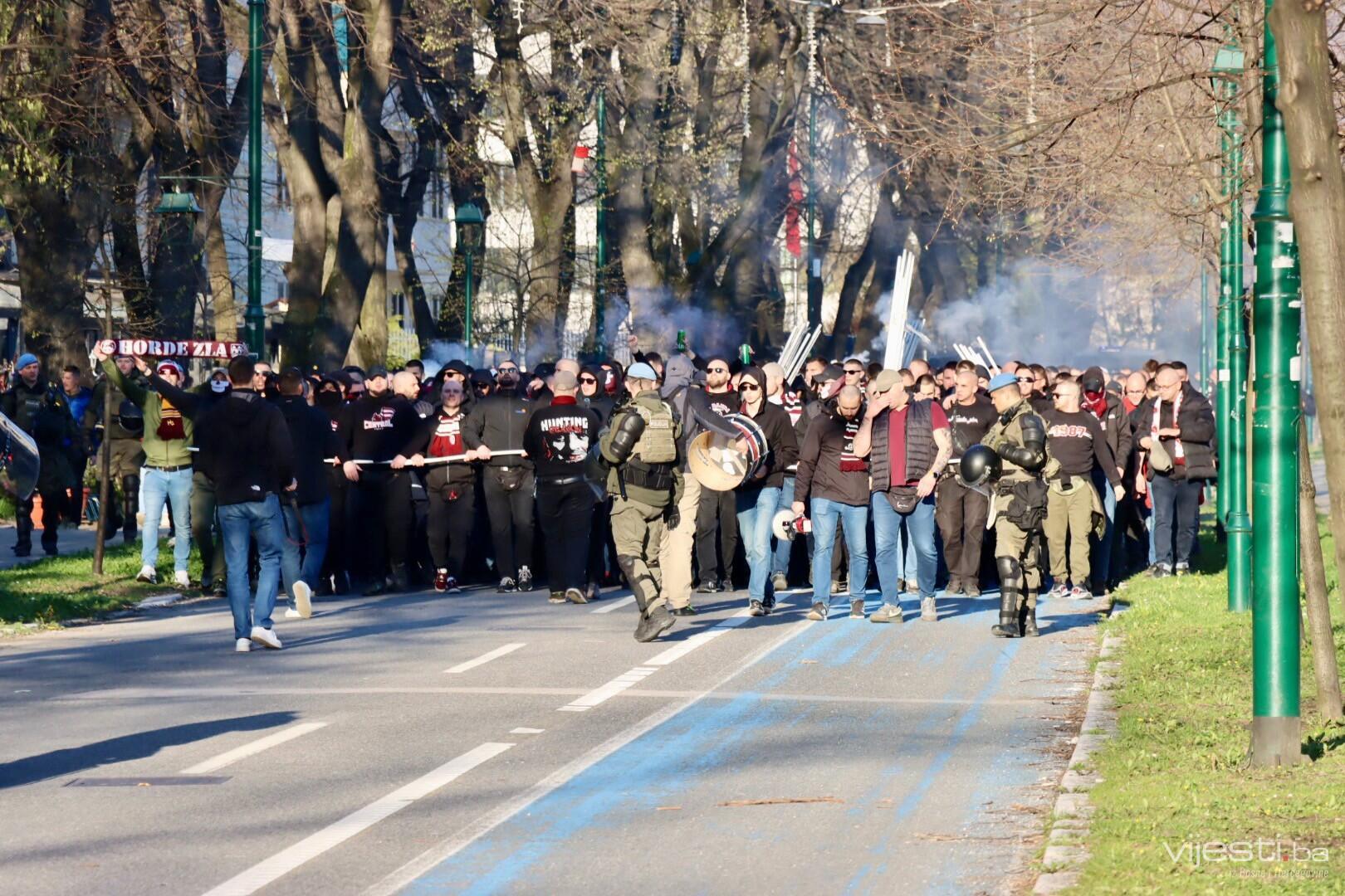 Popularne Horde zla u korteu su prije par trenutaka krenule prema stadionu Grbavica gdje će bodriti svoje ljubimce.
