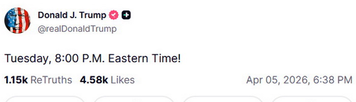 "Utorak, 20:00 po istočnom vremenu!", napisao je Trump u novoj objavi na društvenim mrežama.