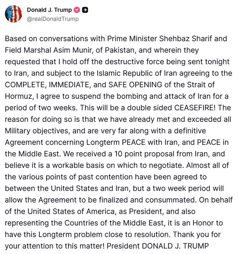 "Na temelju razgovora s pakistanskim premijerom Shehbazom Sharifom i feldmaršalom Asimom Munirom, koji su zatražili da odgodim razornu silu koja je večeras trebala biti usmjerena prema Iranu, te pod uvjetom da Islamska Republika Iran pristane na POTPUNO, ODMAH i SIGURNO OTVARANJE Hormuškog moreuza, pristajem obustaviti bombardiranje i napad na Iran na razdoblje od dvije sedmice. To će biti obostrani PREKID VATRE!