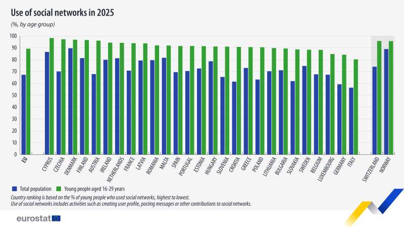 Čak 89,3 posto osoba uzrasta od 16 do 29 godina u EU koristi društvene mreže, što je znatno više od prosjeka opće populacije, gdje je taj udio 67,3 posto.