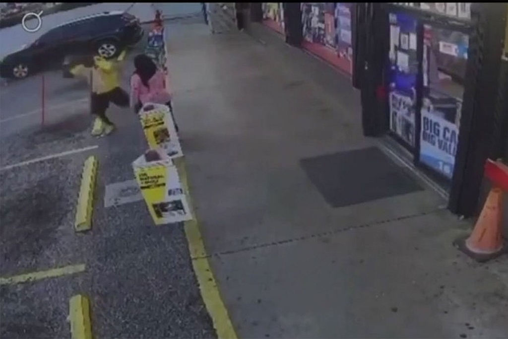 Na snimku se vidi žena kako hoda ispred benzinske pumpe nakon što je navodno čula muškarca kako čekićem oštećuje jedno vozilo.