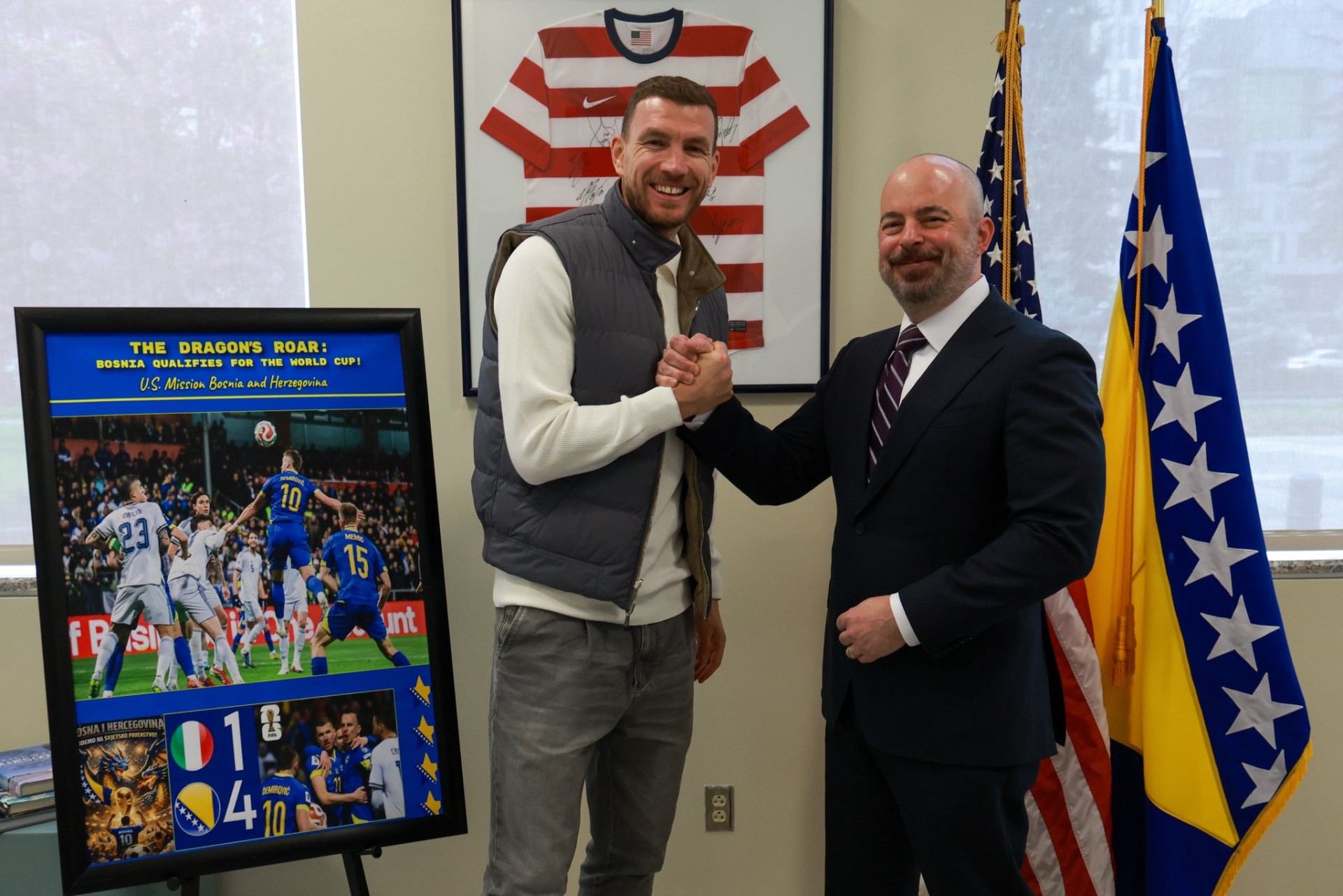 Kapiten fudbalske bh. reprezentacije Edin Džeko jutros je, uoči historijskog putovanja tima u Sjedinjene Države ovog ljeta, posjetio Ambasadu SAD-a sa porodicom.