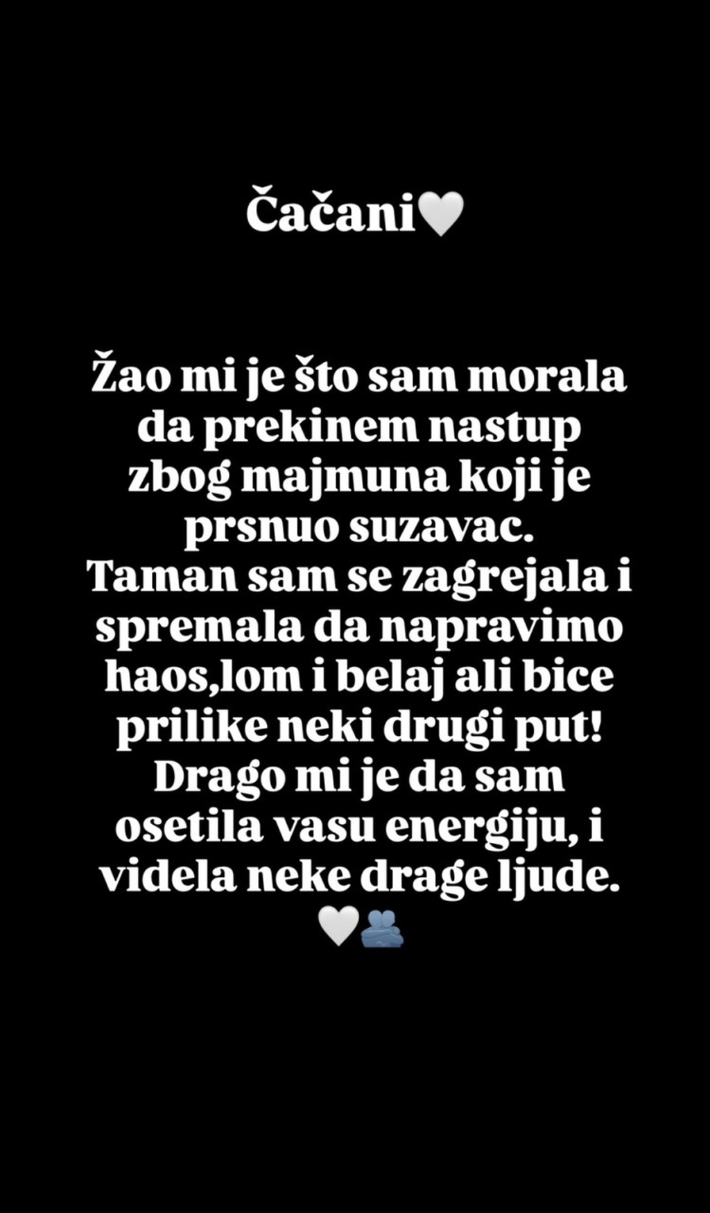 "Čačani, žao mi je što sam morala da prekinem nastup zbog majmuna koji je prsnuo suzavac. Taman sam se zagrijala i spremala da napravimo haos, lom i belaj, ali biće prilike neki drugi put! Drago mi je da sam osjetila vašu energiju i vidjela neke drage ljude", napisala je.
