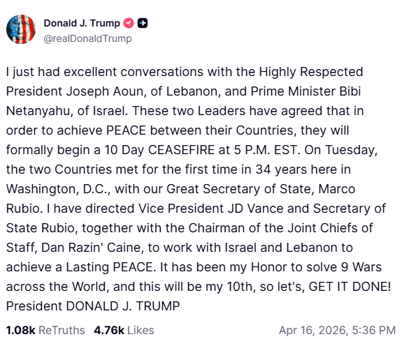 Predsjednik Sjedinjenih Američkih Država Donald Trump najavio je desetodnevni prekid vatre između Libana i Izraela, koji bi trebao početi u četvrtak u 17.00 sati po istočnoameričkom vremenu (EST).