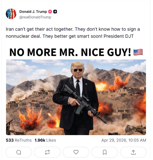 - Iran ne može da se sredi. Ne znaju kako da potpišu nenuklearni sporazum. Bolje bi im bilo da se brzo urazume! - napisao je Trump na mreži Truth Social, uz fotografiju na kojoj drži oružje i natpis "No More Mr. Nice Guys!" ("Nema više finog momka").